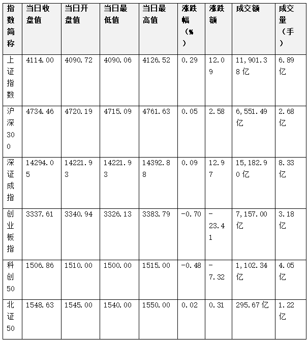 2026年1月19日,A股市场呈现缩量震荡、指数分化格局。上证指数小幅收涨,创业板指下跌。具体指数数据如下: