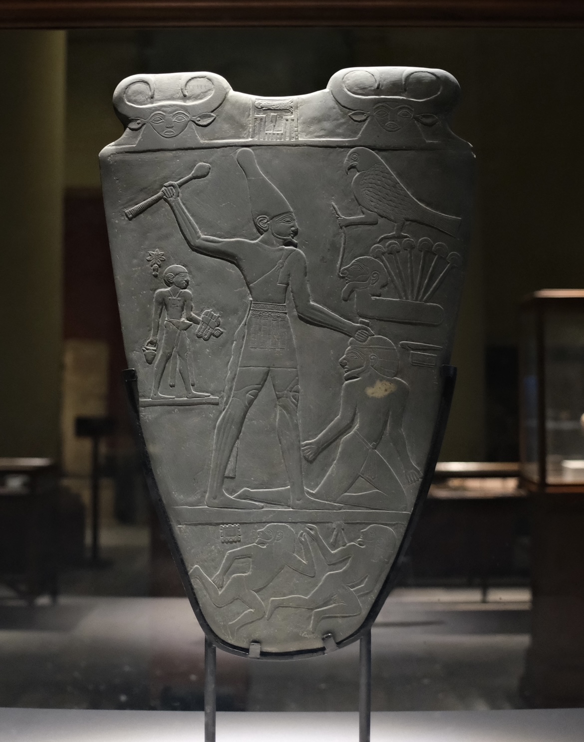 这块看似普通的眼影研磨盘,实则是古埃及最早的 “政治宣传海报”,正反两面的图案藏满王权密码 —— 白冠与红冠的切换、鹰神荷鲁斯的加持,皆在宣告纳尔迈 “上下埃及之王” 的合法性。