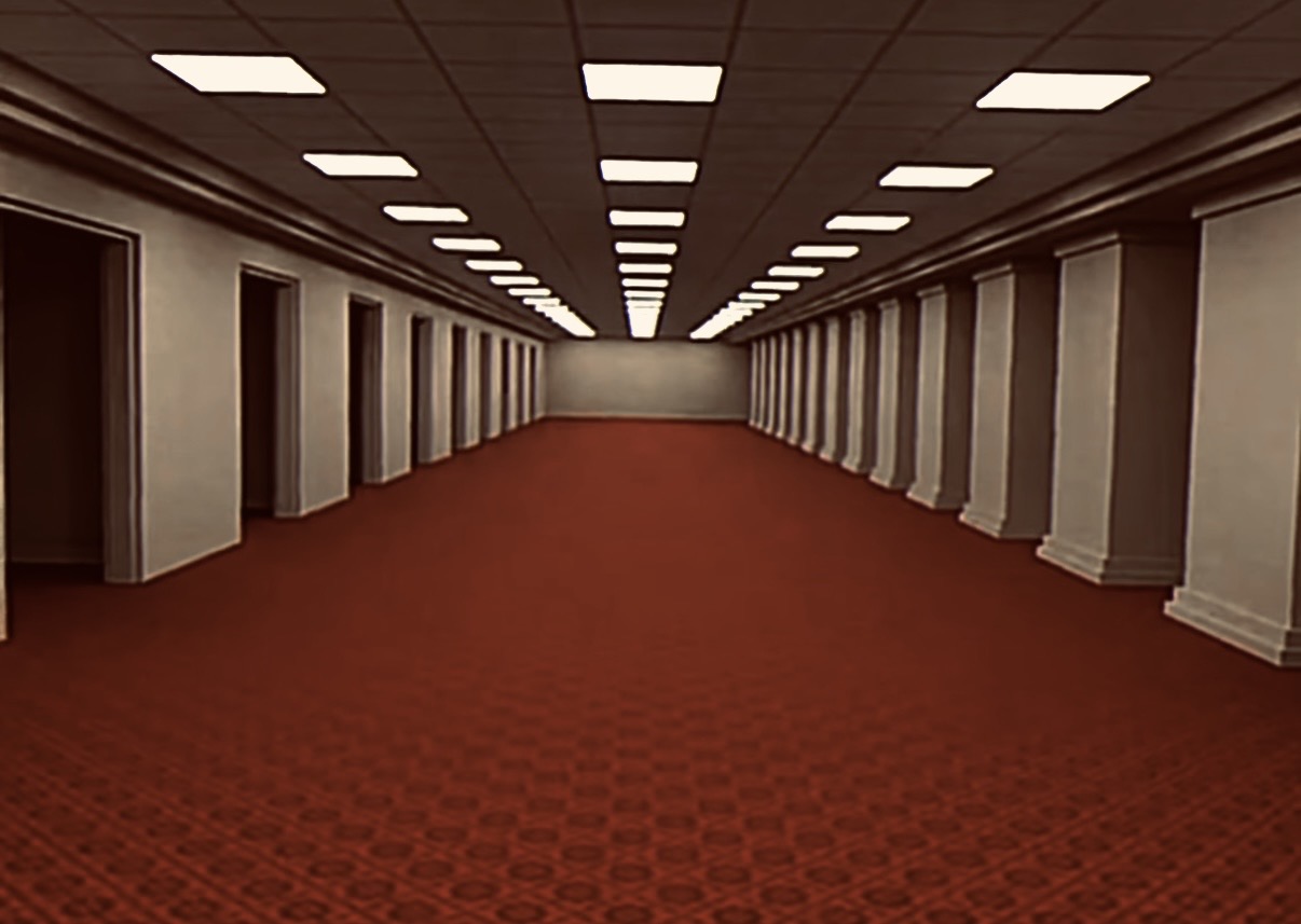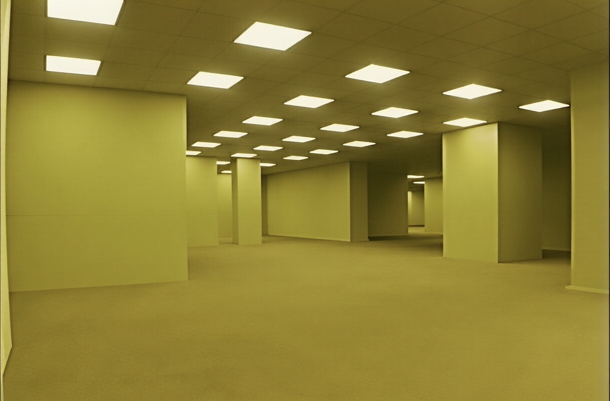 “后室”概念的诞生非常偶然,其核心在于阈限空间(Liminal Space)美学的具象化。 2019年5月,在著名匿名论坛 4chan,有一位用户发帖,要求大家上传“看起来很不对劲、令人感到不安”的图片。随后,有人上传了一张由电脑生成的三维渲染图。图片展示了一片铺着黄色墙纸、潮湿的旧地毯的走廊,光线是单调的黄色,由荧光灯照明,空无一人。这张图片最初并没有名字,只是让人感到一种难以言喻的疏离感和恐惧感(即“阈限空间”感,指那些作为过渡用途、无人停留的空间,如空荡的商场、走廊)。
