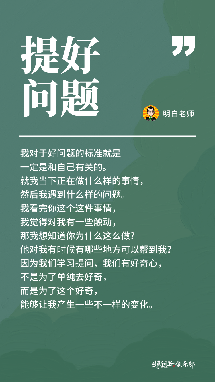 我对于好问题的标准就是一定是和自己有关的。就我当下正在做什么样的事情,然后我遇到什么样的问题。我然后看完你这个这件事情,我觉得对我有一些触动,那我想知道你为什么这么做?他对我有时候有哪些地方可以帮到我?因为我们学习提问,我们有好奇心,不是为了单纯去好奇,而是为了这个好奇,能够让我产生一些不一样的变化。