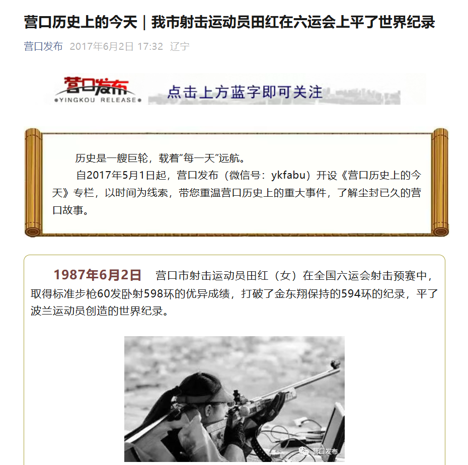 1987年,21岁的田红参加第六届全运会射击比赛,在标准步枪60发卧射项目预赛中,打出598环的成绩,追平了波兰运动员保持的世界纪录。
