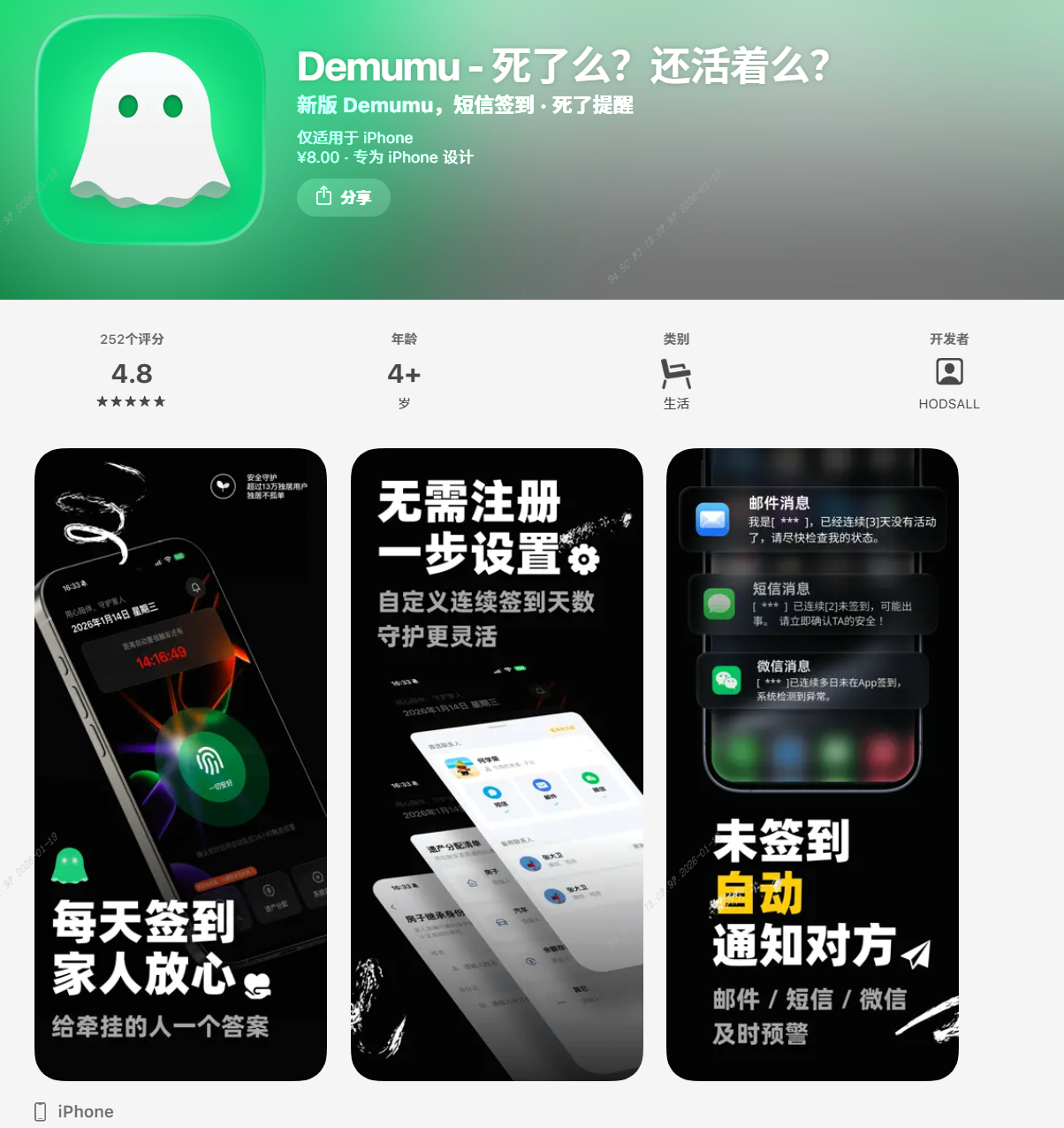 1. 死了么(已改名Demumu):一款关注独居者安全的签到类App,用户通过每日签到报平安,若未签到系统会邮件提醒紧急联系人。