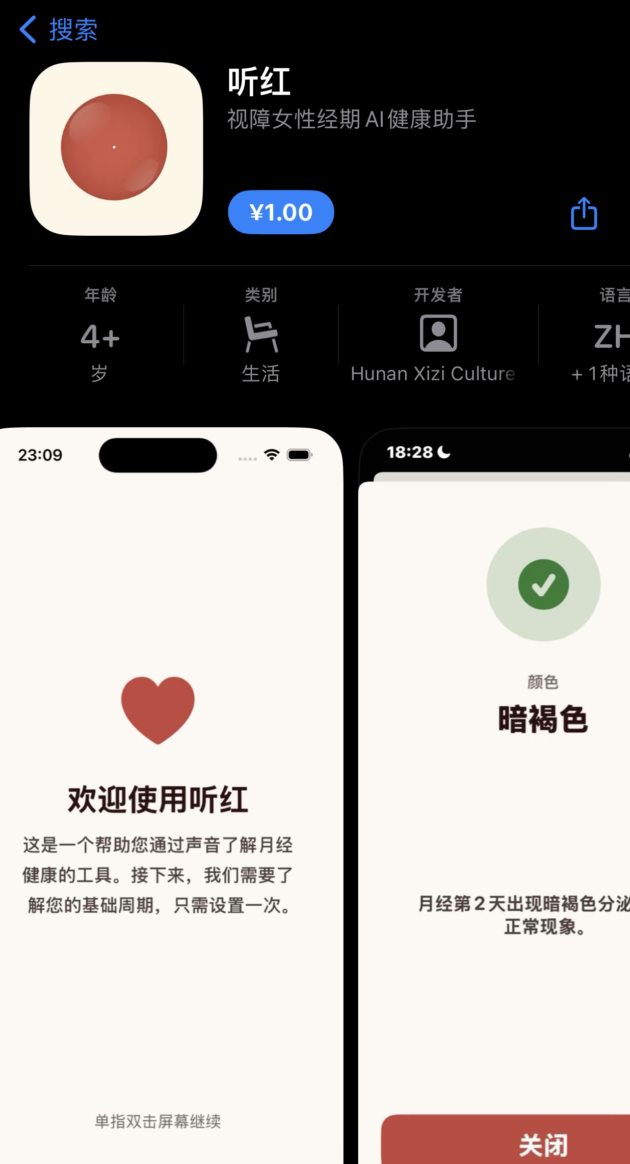 2.HearRed“听红”(盲人女性健康助手):专为视障女性设计的AI经期健康助手。支持全程语音交互,可通过拍摄经血图片由AI分析颜色与状态,并提供语音健康建议。开发者:高熵工作室/华强