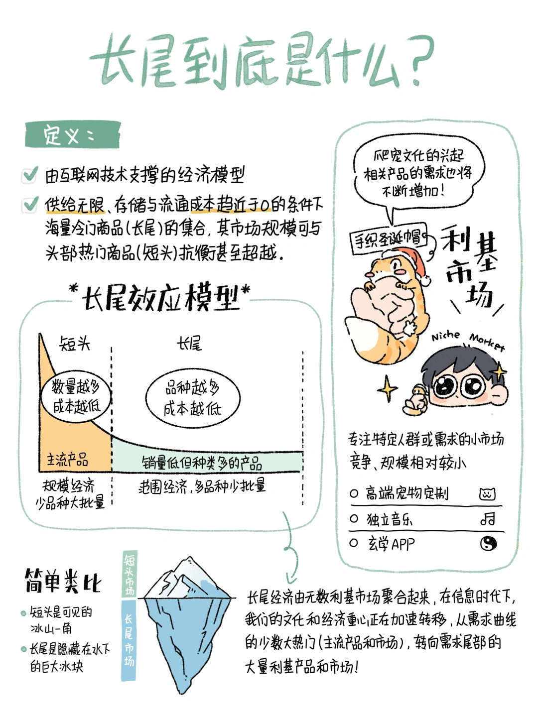 长尾就是由无数小众、个性化的需求拼起来的大市场——当存储和流通成本极低时,这些看似不起眼的“小需求”加在一起,能比主流爆款创造更大的价值。