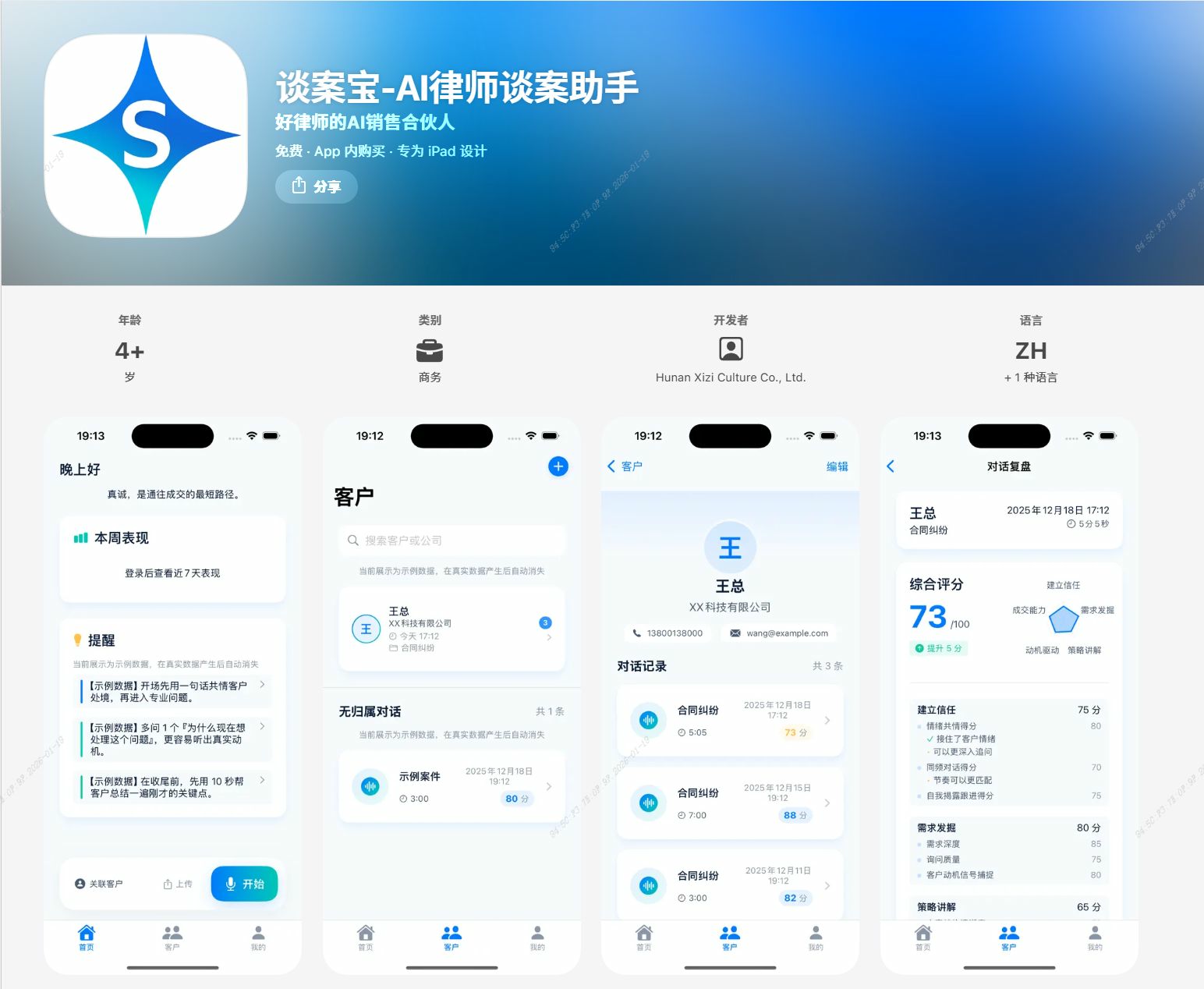 5.谈案宝:AI律师谈案助手,专为新律师设计。通过智能分析谈话录音,帮助律师提升沟通技巧、把握客户需求,并辅助完成报价与成交,是律师的AI销售合伙人。开发者:高熵工作室/华强