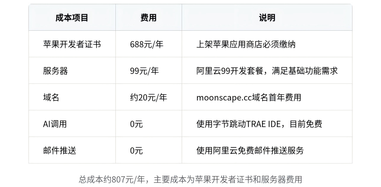 借助AI开发一款轻量级应用,其年度固定成本可控制在千元以内,其中人力成本趋近于零,仅剩苹果开发者年费和基础服务器两项核心支出。