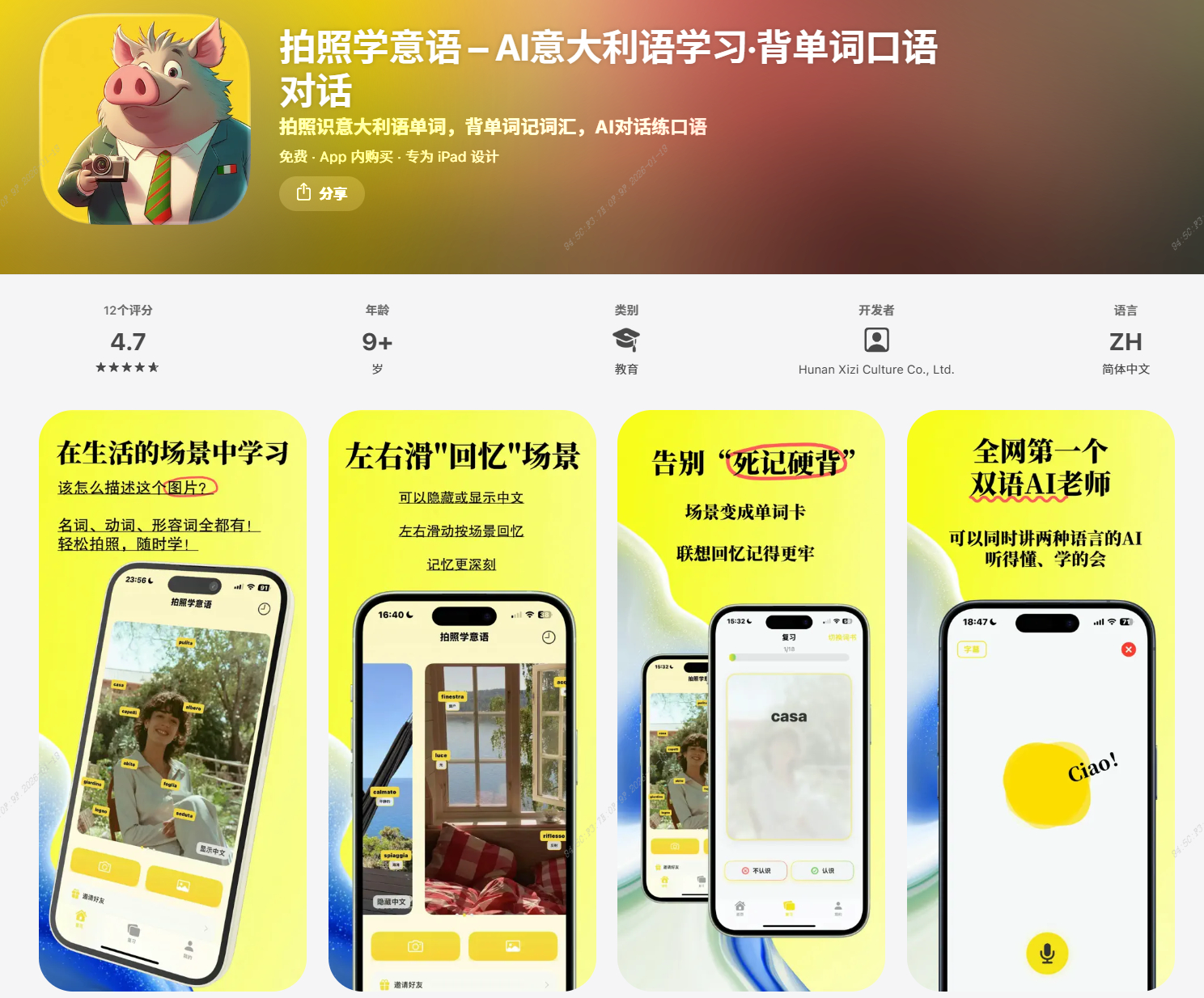 3.拍照学意语:创新意大利语学习工具,通过拍照识别场景中的单词与句子,告别死记硬背。内置双语AI老师,可进行口语对话练习,帮助你在真实场景中自然掌握意大利语。开发者:高熵工作室/华强