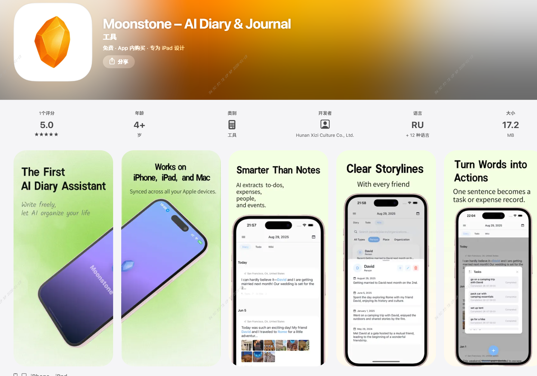 4.Moonstone(AI日记&日常todo管理) :智能日记助手,让你自由书写,AI自动整理。它能从日记中提取待办事项、支出记录、人物与事件,帮你梳理人际关系与生活脉络,让记录更高效、更有条理。开发者:高熵工作室/华强