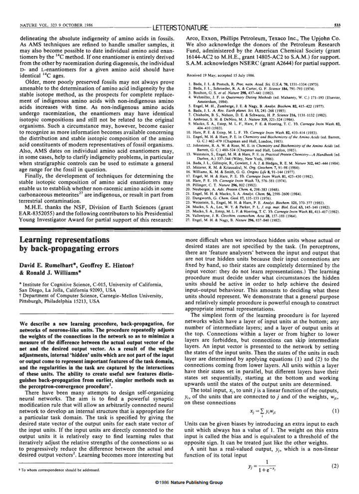 *1986 年《自然》杂志封面或论文页 | 辛顿发表反向传播算法的里程碑论文