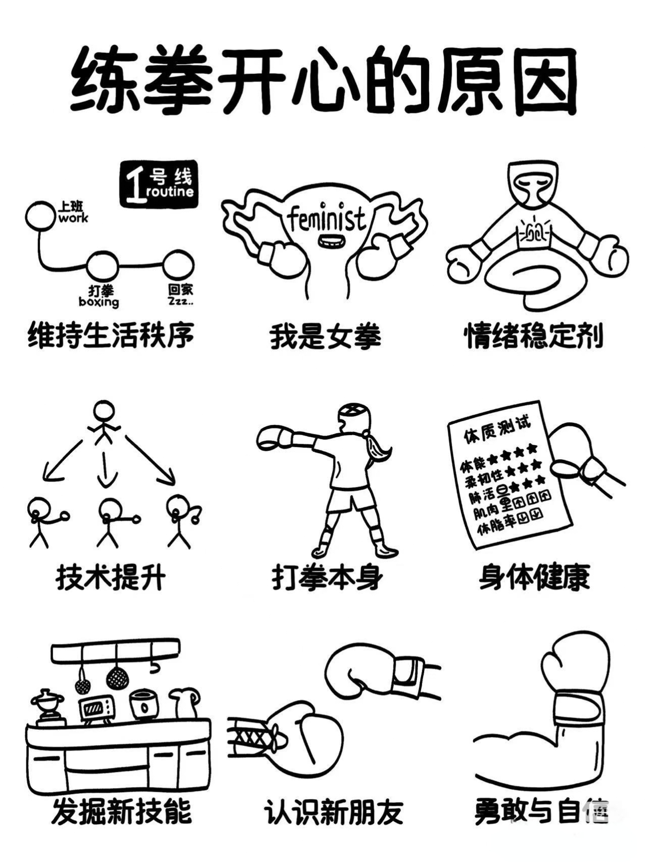 - “练拳击不是为了KO别人,而是为了KO生活中的无聊和内耗。”