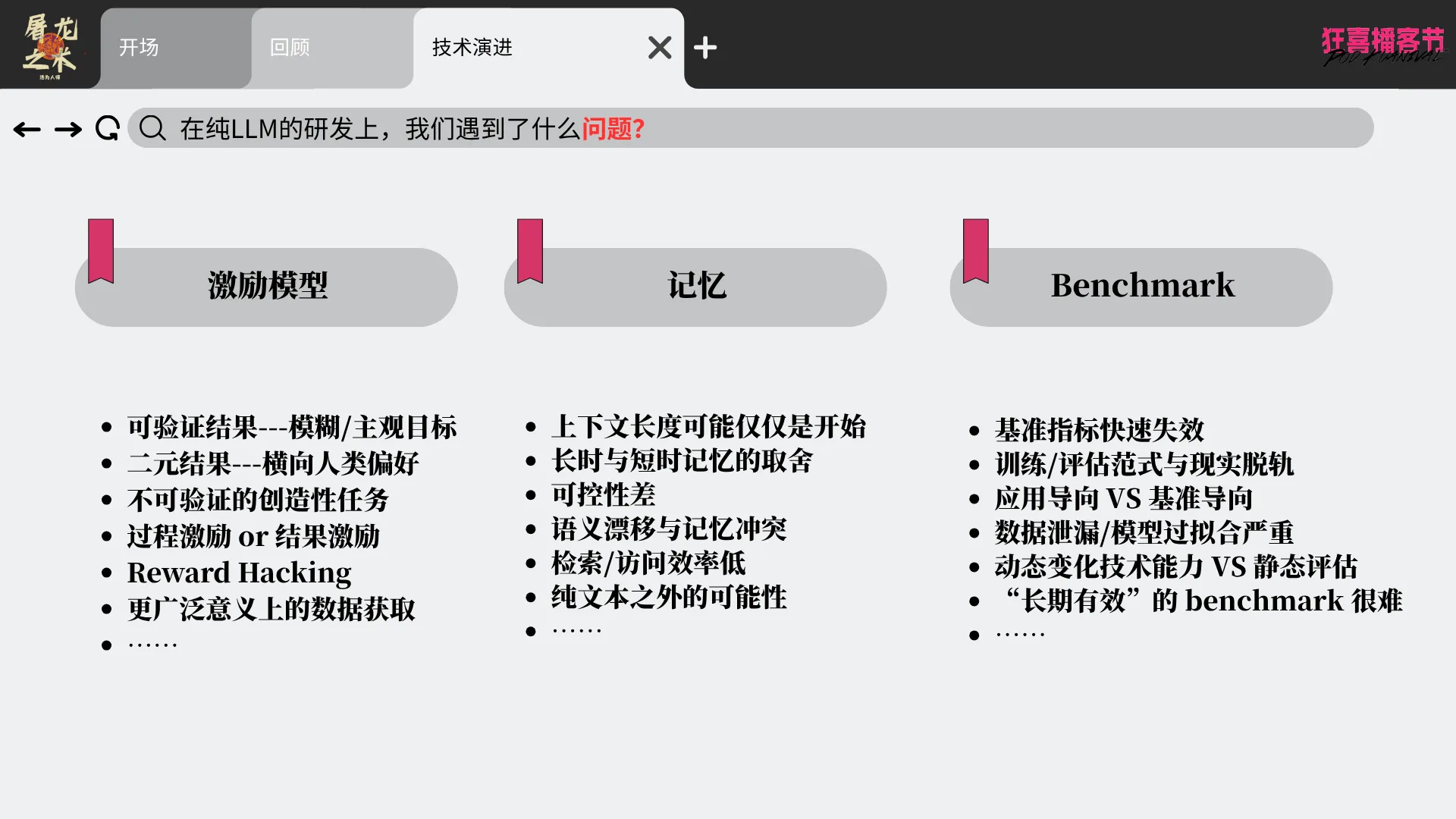 00:20 去年11月我写的PPT-大模型厂商在解决什么问题:记忆、激励模型、Benchmark