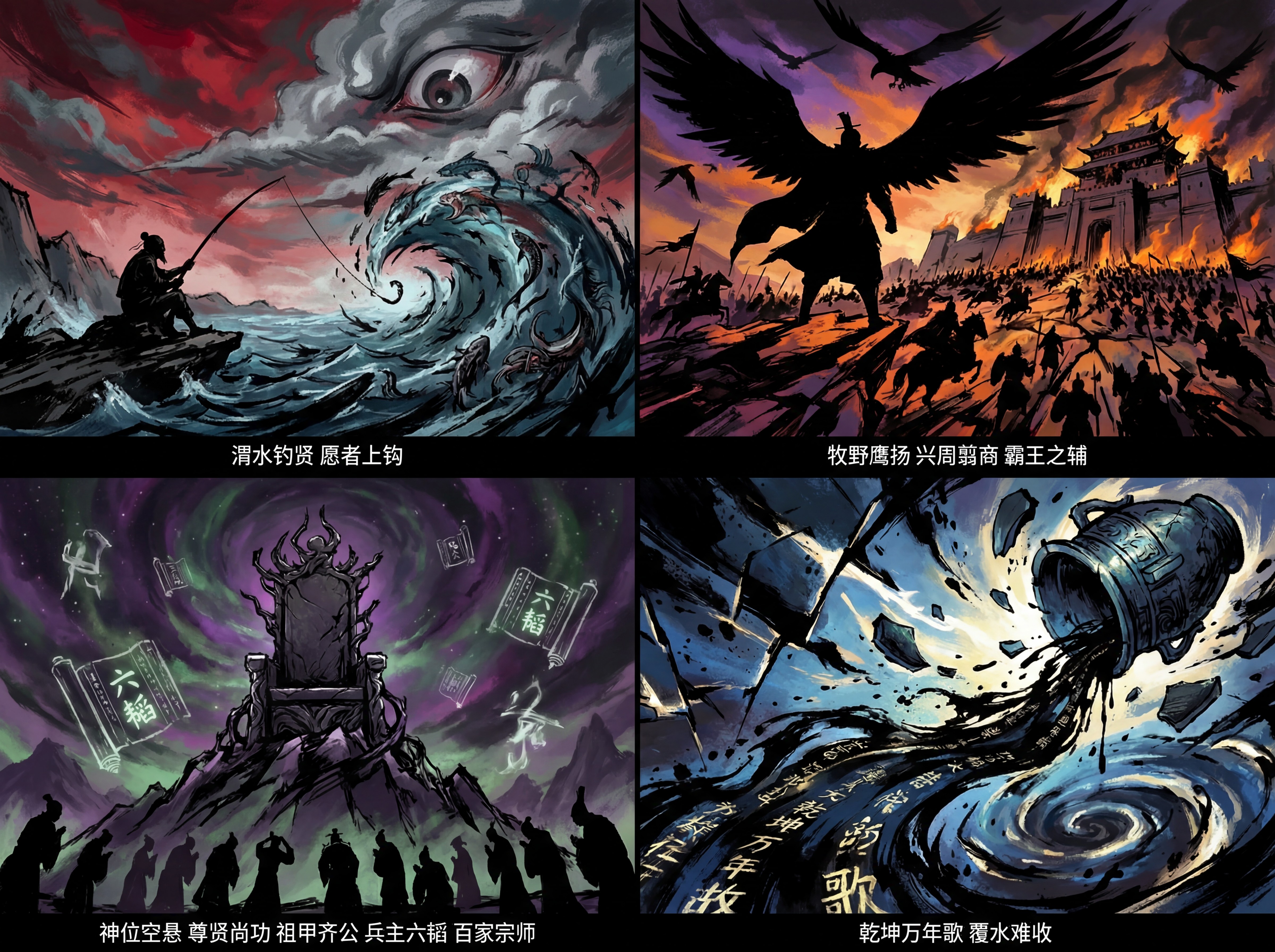 四岳吕尚 渭水钓贤 覆水难收 愿者上钩 霸王之辅 维师尚父 牧野鹰扬 兴周翦商 神位空悬 尊贤尚功 祖甲齐公 兵主六韬 乾坤万年歌 百家宗师【姜子牙】