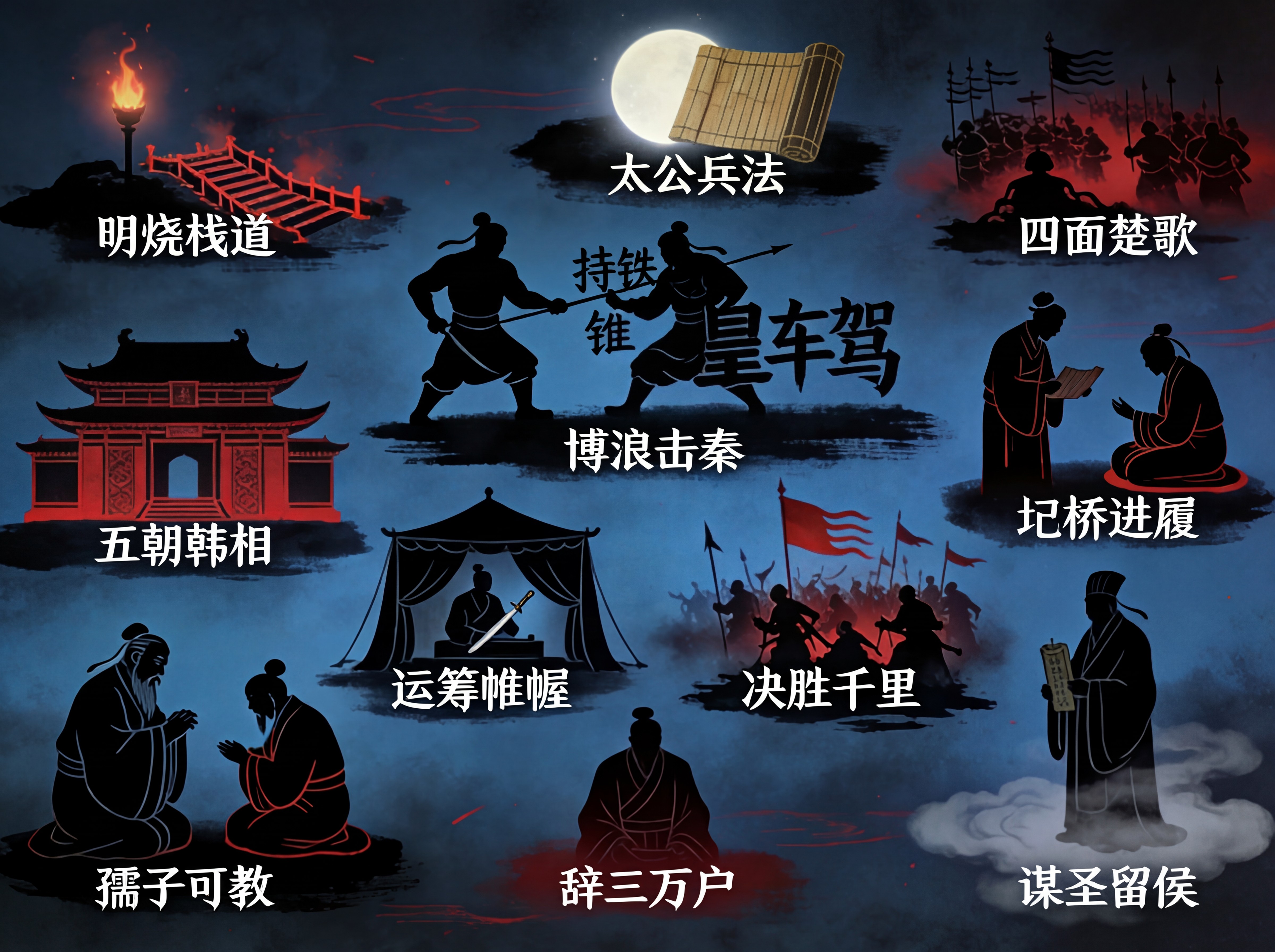 五朝韩相 博浪击秦 圯桥进履 太公兵法 孺子可教 明烧栈道 四面楚歌 运筹帷幄 决胜千里 辞三万户 谋圣留侯【张良】