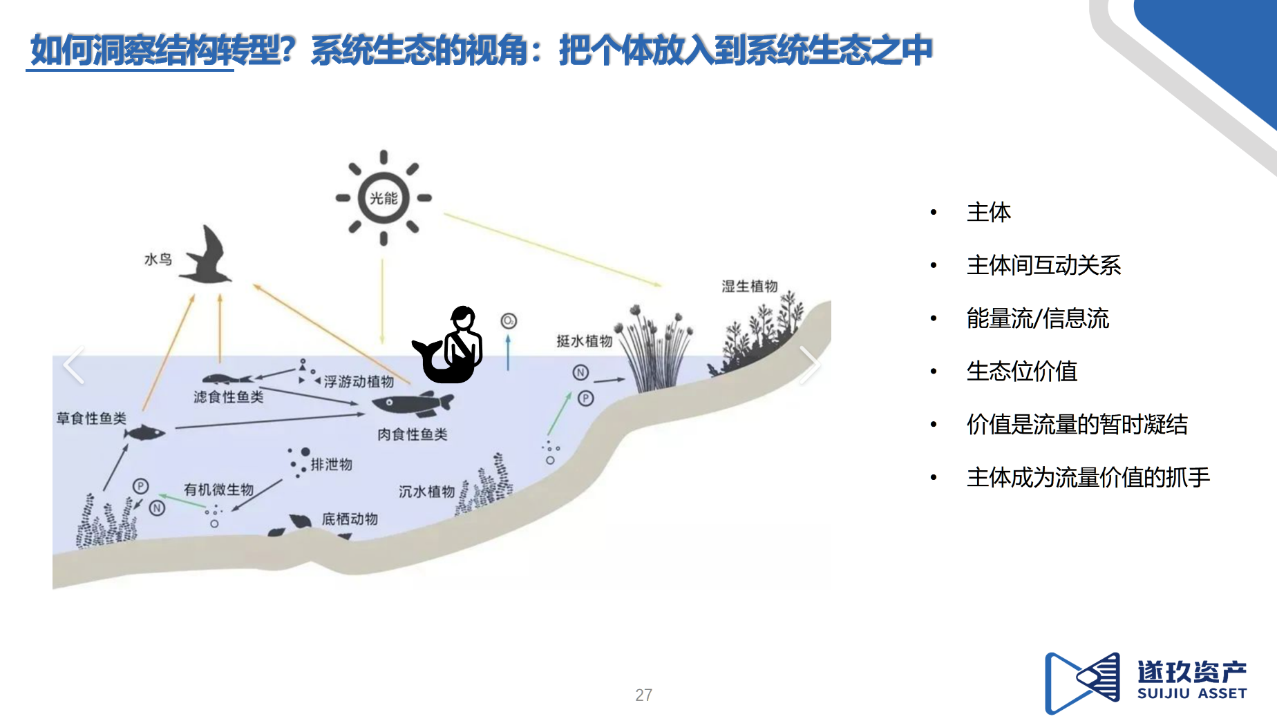 - 从寻找最强壮的鱼转向分析整个池塘的生态系统,关注能量流、信息流如何在不同主体间流动与重新分配。