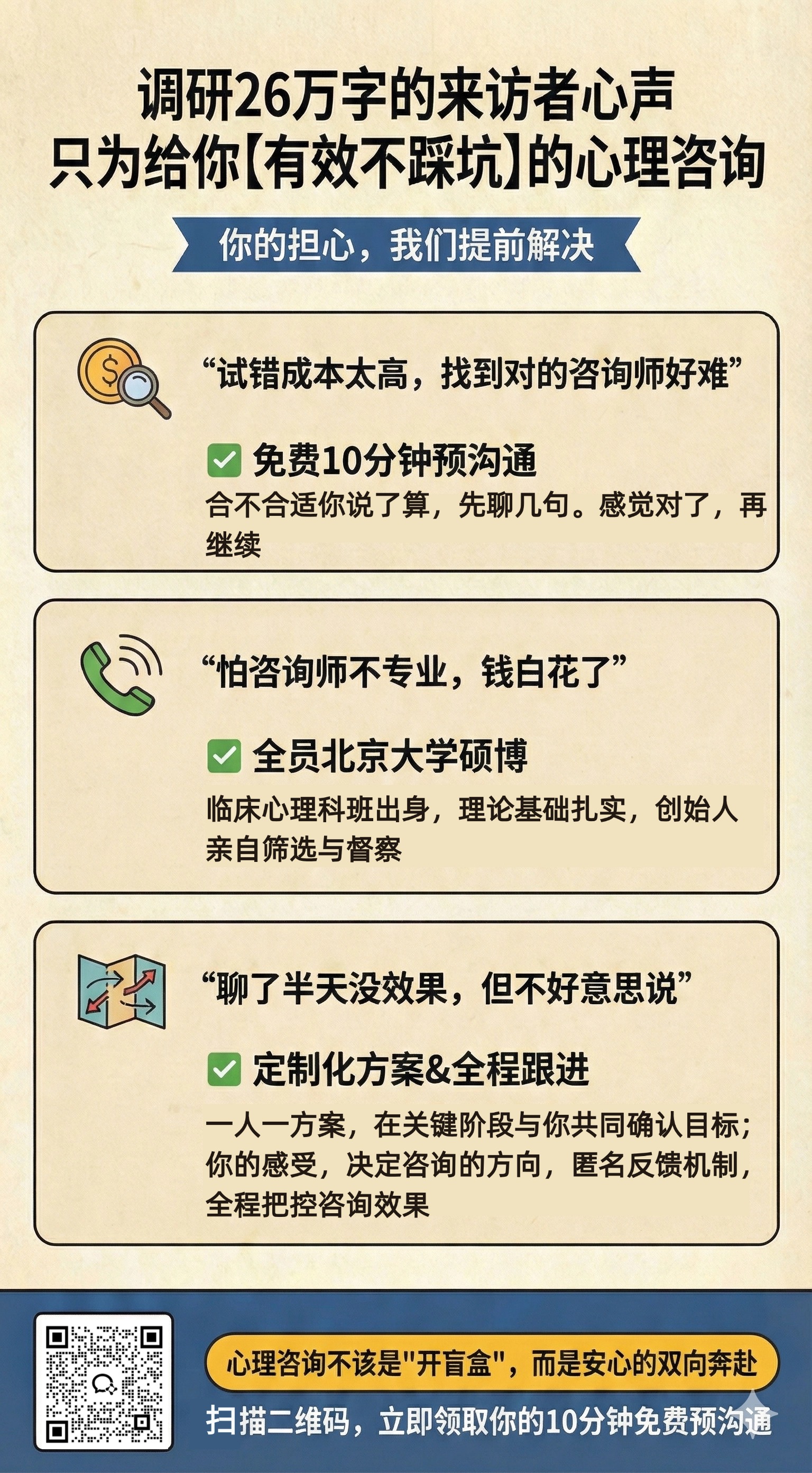 众所周知,找到一个合拍的心理咨询师需要付出很多的时间精力以及金钱成本,如果你不想自己费时费力从茫茫人海当中筛选合适的咨询师,可以来牧阳的心理咨询工作室看看:工作室的所有咨询师都是北京大学临床心理系硕博出身,所有咨询师都经过牧阳严格的1V1面试。我们给所有来访者都设置了免费的 10 分钟咨询预沟通,如果这 10 分钟聊完你觉得不合适,随时可以选择再换一位咨询师聊,直到找到适合你的咨询师为止。每次咨询是采用 50% 预付款制,如果你这次聊完觉得不满意,那么剩下的一半的钱就不用付了。