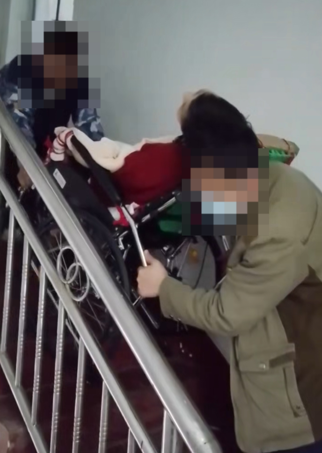 ■图 / 司机和陈某(右一)把李小中从湖南家中抬下来