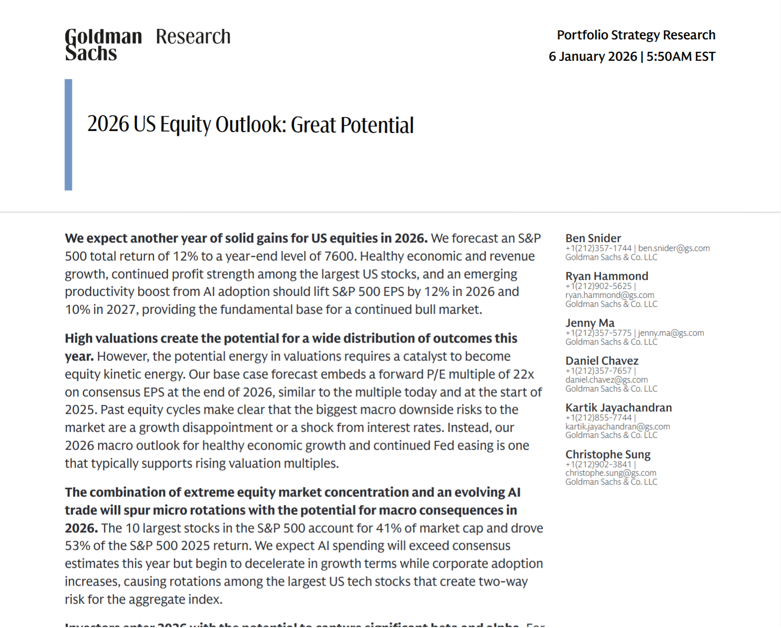 高盛2026年1月6日发布的《2026 US Equity Outlook:Great Potential》研报明确指出,美股将延续强势表现,标普500指数全年总回报率预计达12%,年末目标点位7600点,盈利增长与AI赋能将成为核心驱动力。