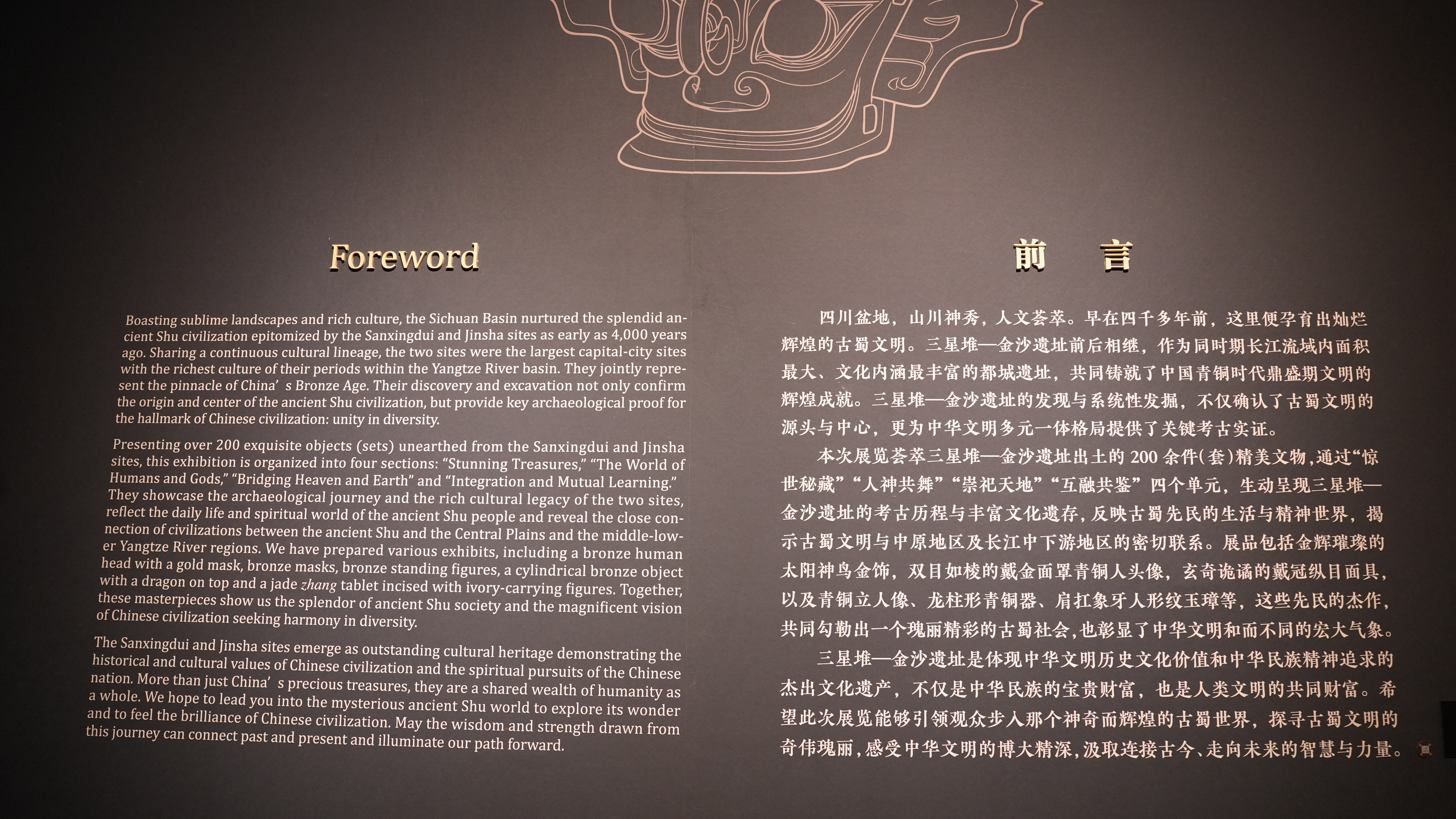 本次展览荟萃200余件(套)来自三星堆博物馆、成都金沙遗址博物馆、四川省文物考古研究院、成都市文物考古研究院以及中国国家博物馆的精美文物,引领大家步入那个神奇而辉煌的古蜀世界,一起凝视这些承载着文明密码的奇珍,这不仅是在回望一段失落的辉煌,更是在汲取连接古今、走向未来的智慧与力量。