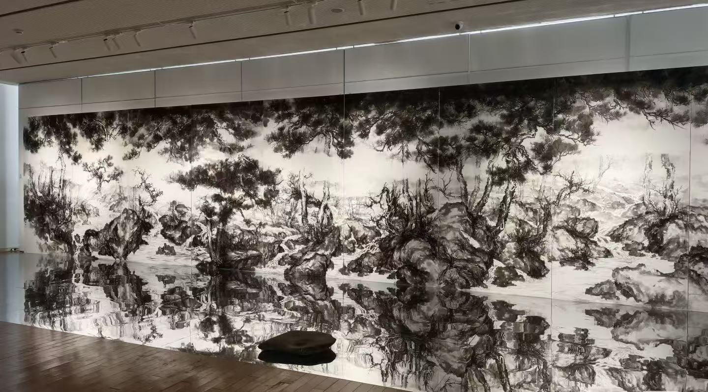 描述展览现场:镜面与山水画结合,观众可入画。