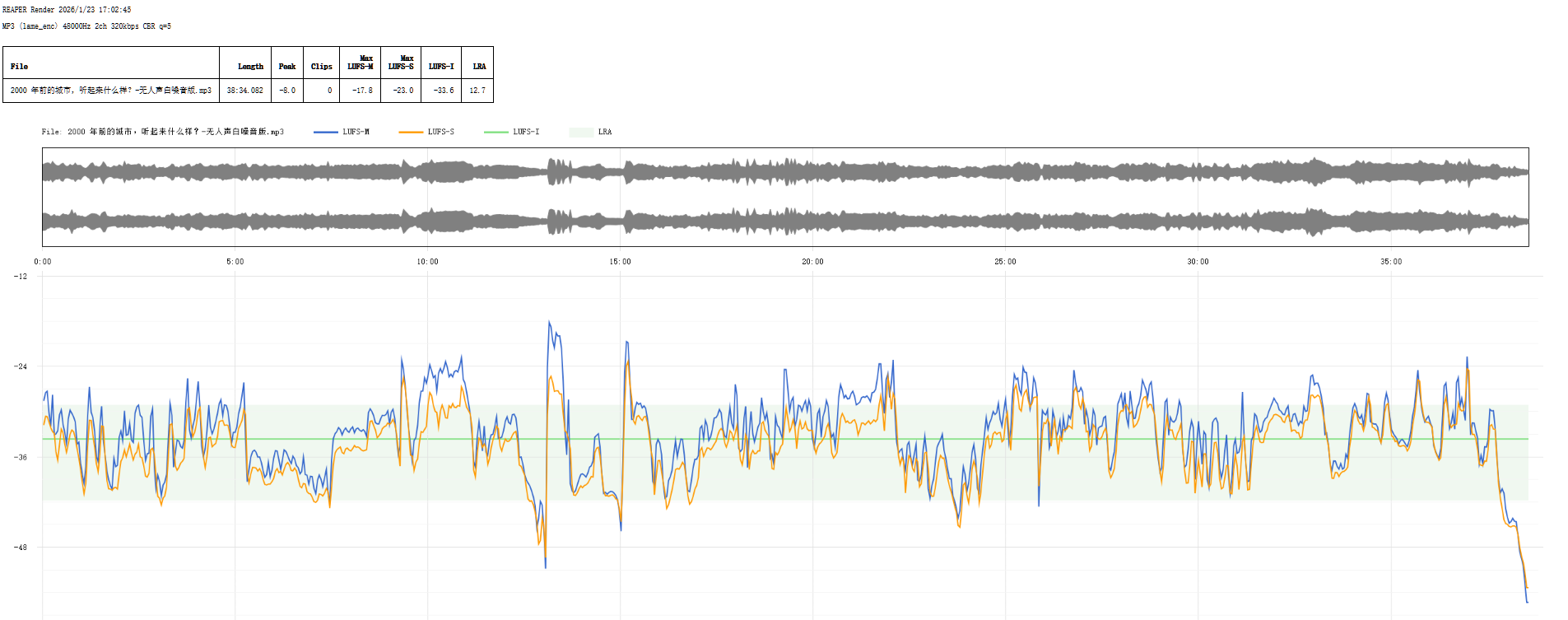 上传格式为 MP3 44100Hz 2ch 320kbps CBR 立体声(波形图如下)。为了保证声音效果做了整体均衡并相对有人声版大大压低了平均响度(-33.6 LUFS),但其中罗马斗兽场、贸易市场等部分场景由于声学特点,听起来可能会有一点点嘈杂。