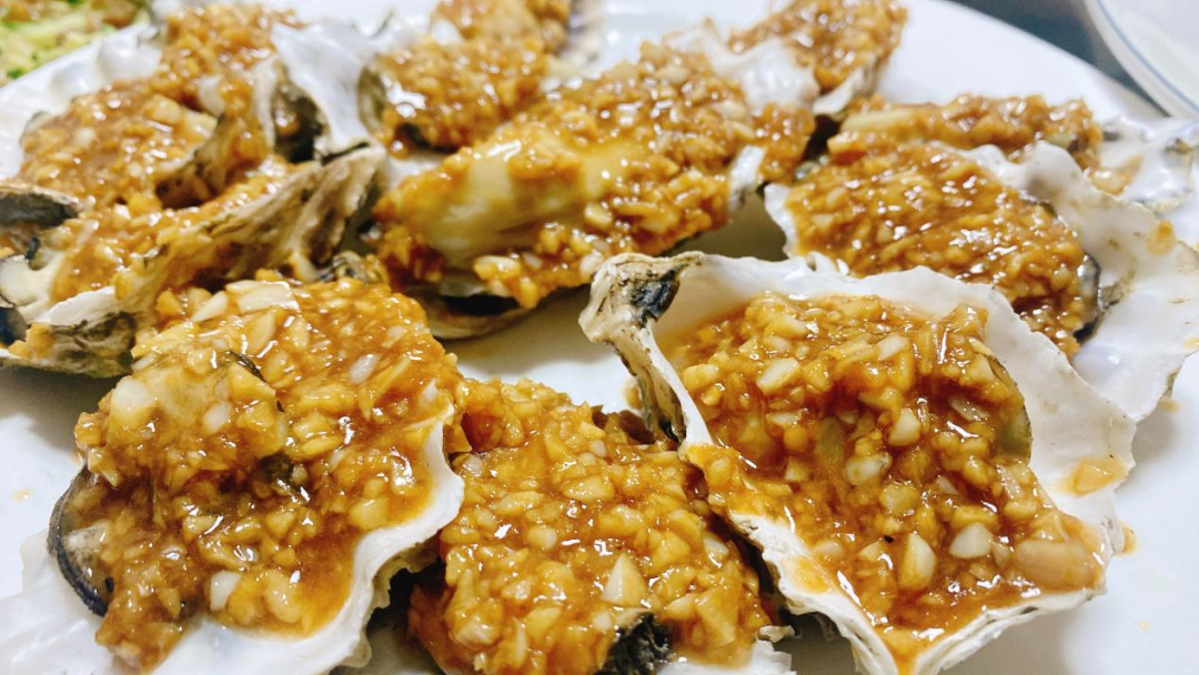 在青岛,有很多海鲜在做的时候都会放garlic,比如:烤生蚝(grilled oysters)。They have so much garlic on them.