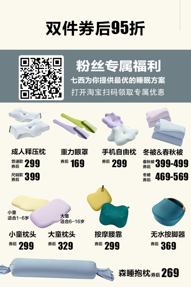 本节目推荐的护颈助眠「七西枕头」不仅可以有效缓解颈椎疲劳,快速帮助进入深睡眠状态;还根据人体工学设计,更适合颈椎生理曲线,不会让你睡醒肩颈酸痛,落枕,实现翻身自由,独特的分码设计可以根据人体的身高体重,头围肩宽选择适合自己的睡眠枕,平时睡不好,肩颈不好的可以去了解看看。