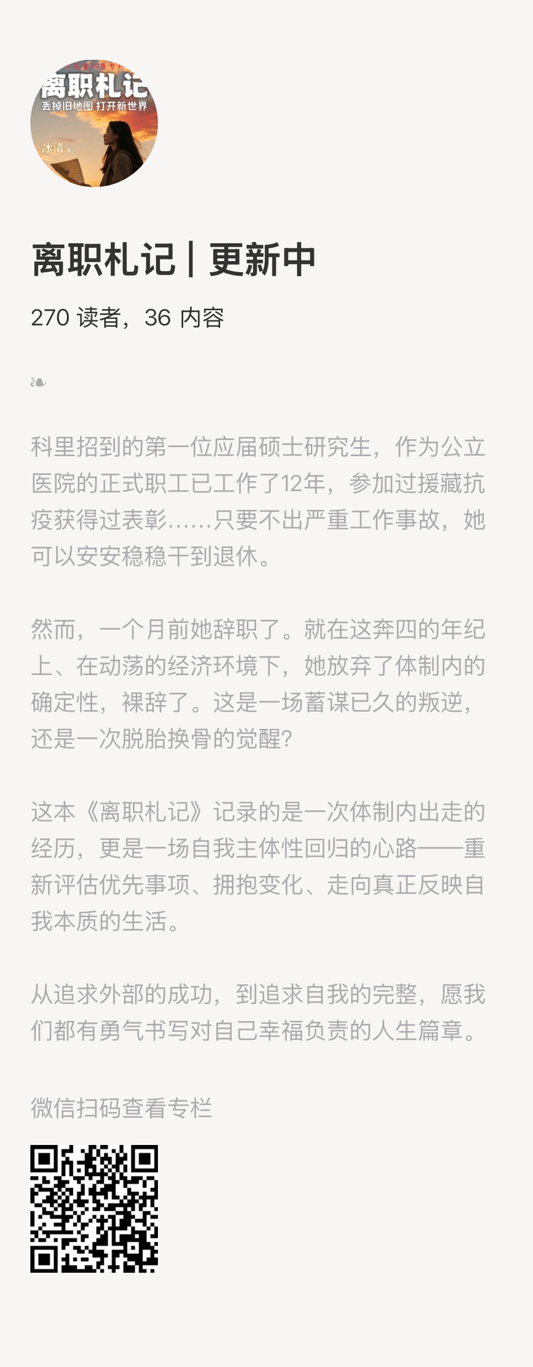 冰清的《离职札记》,更完整地记录了她一路以来的心路历程,感兴趣的朋友也可以扫描下方二维码订阅👇