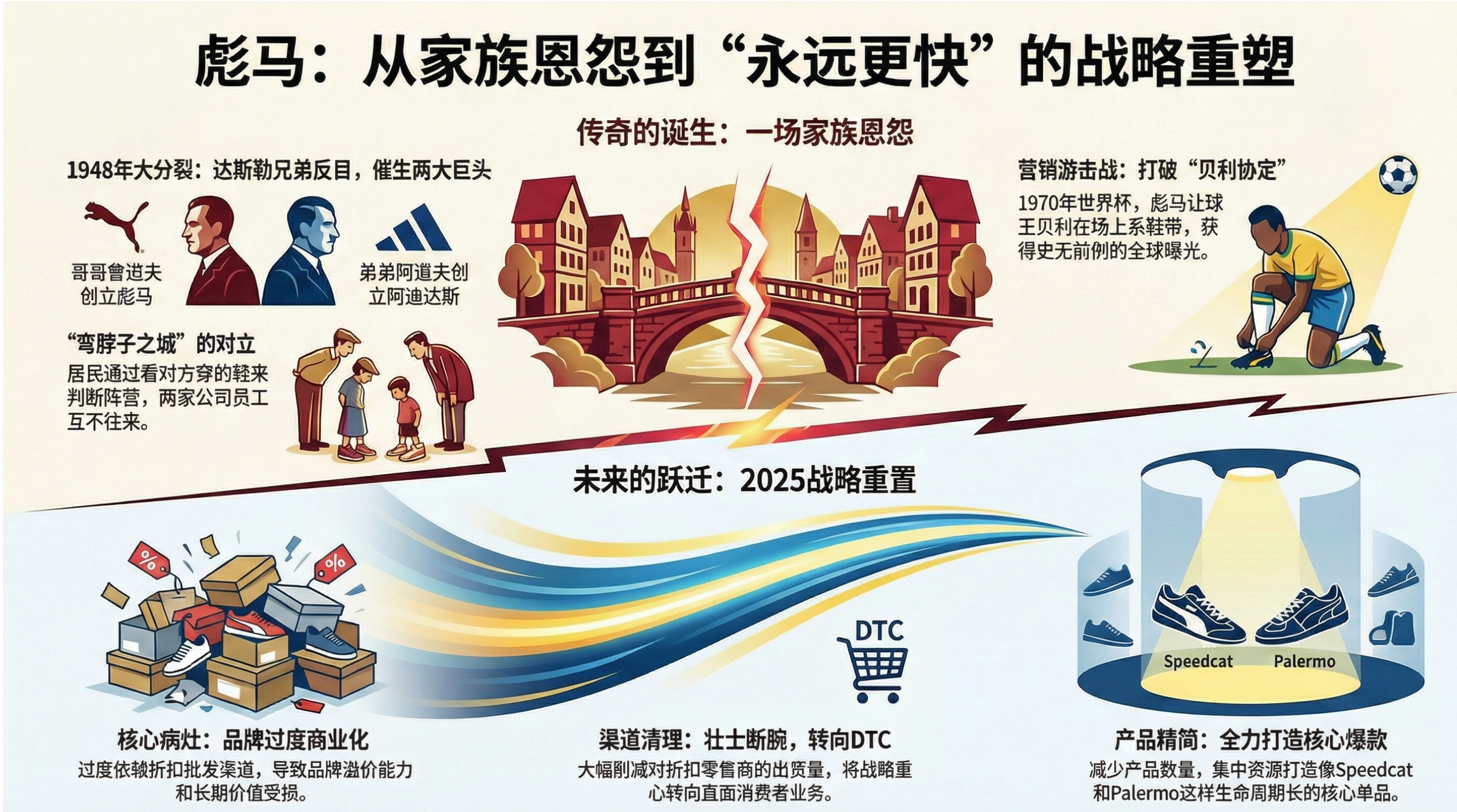 - 关键论点:Puma并非线性成功故事,诞生于兄弟反目,在巨头夹缝中野蛮生长,常在风光时迷失。它不定义行业,而是寻找规则漏洞,创造新玩法,历史充满戏剧性转折。