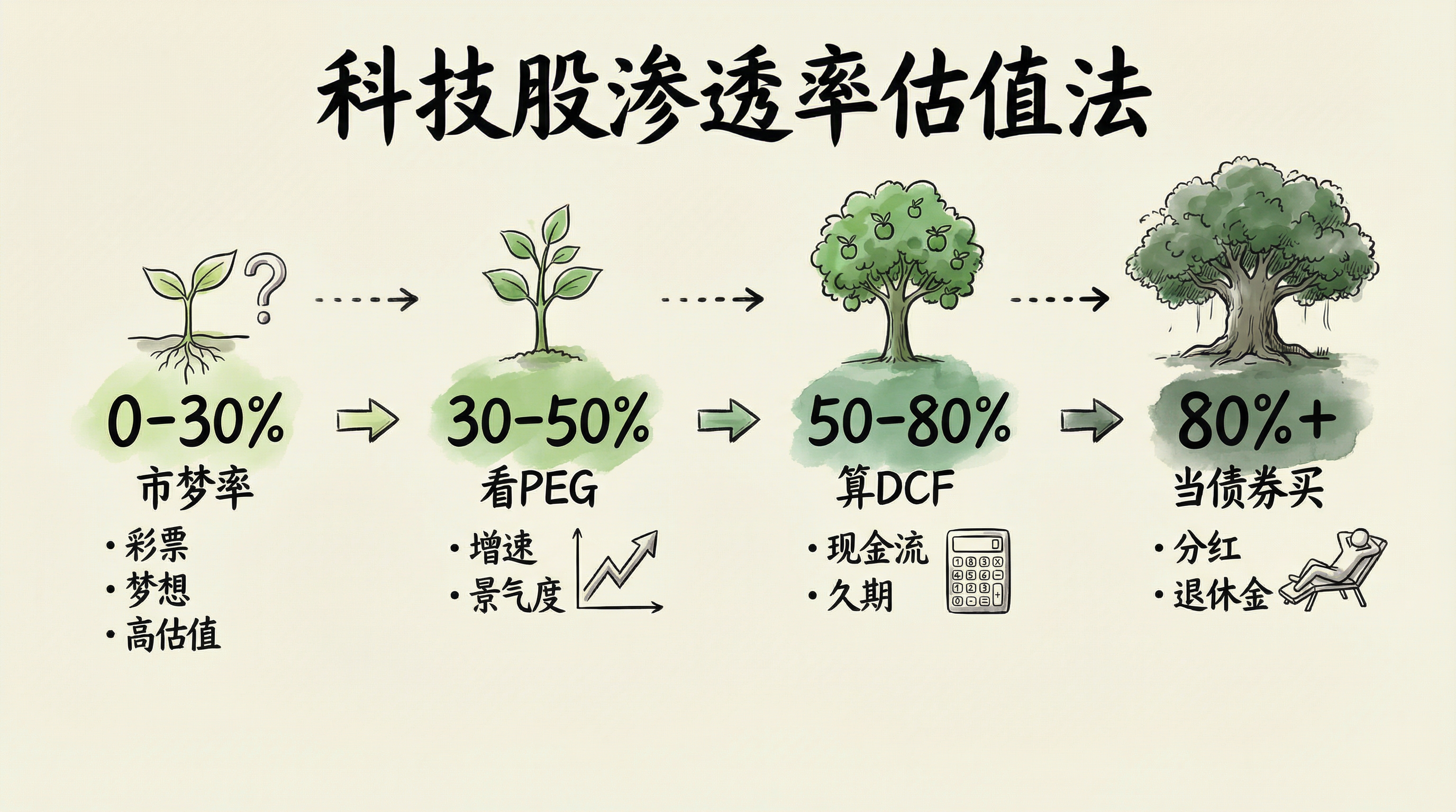 - 渗透率50-80%:算DCF,就像40岁的男人,算他还能拿几年工资