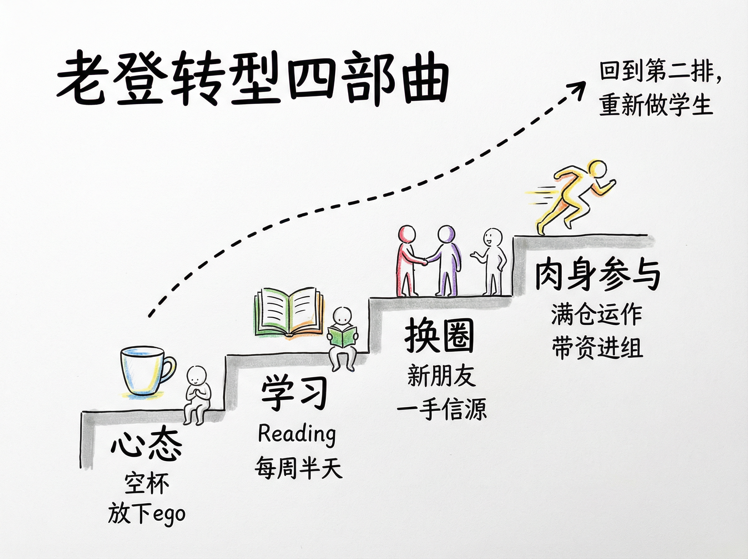 - 心态:回到第二排,重新成为学习者,坐冷板凳