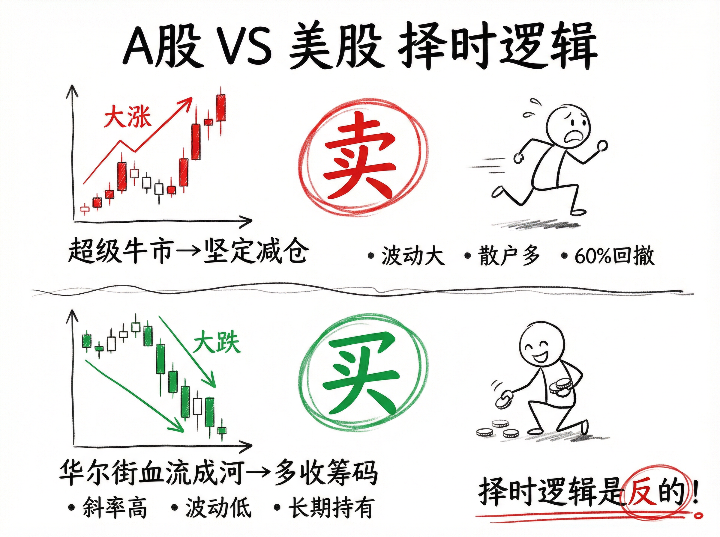 - 核心策略:美股大跌时买入,A股大涨时卖出——择时逻辑是反的