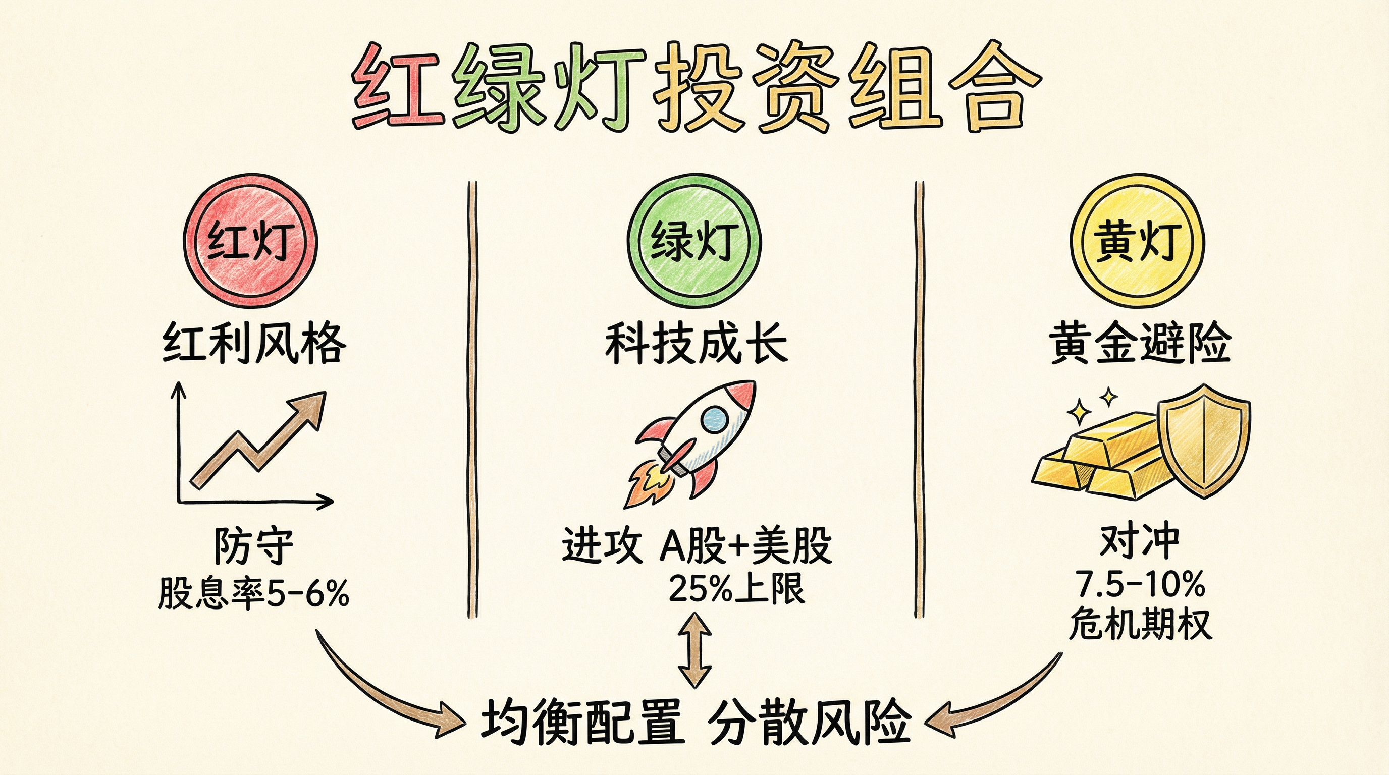 - 金句:"红绿黄,红是红利,绿是科技,黄是黄金——三个都要有"