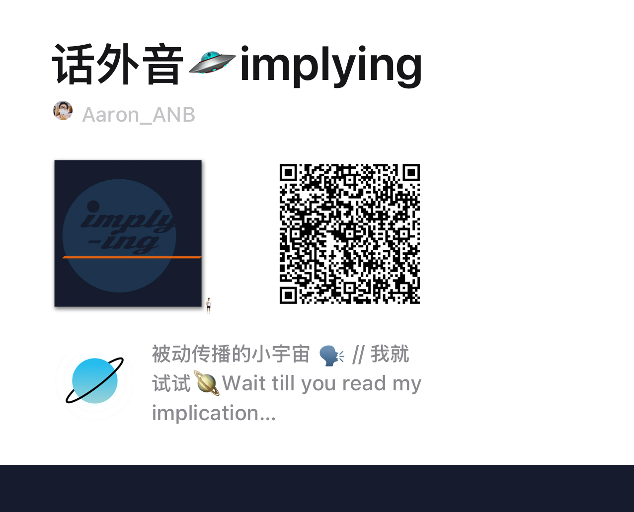 本期节目也有特殊的意义:这也会是 Aaron 个人播客的第一期节目!从本期他对我的提问来看,他一定会做出一档很有趣的播客,哈哈哈哈。他的播客信息如下: