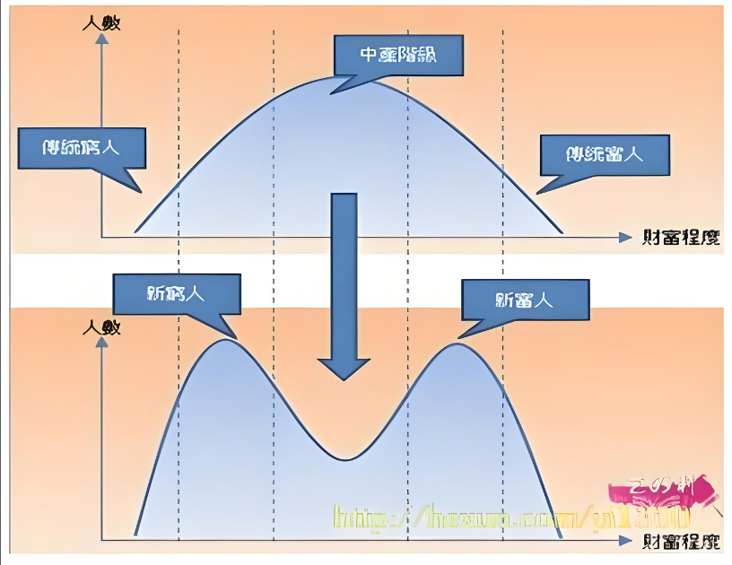 而原本占据中间的大量中产阶层,正在被不断挤压、变薄,甚至消失。整体形态,就像一个字母M:两端抬升,中间塌陷。