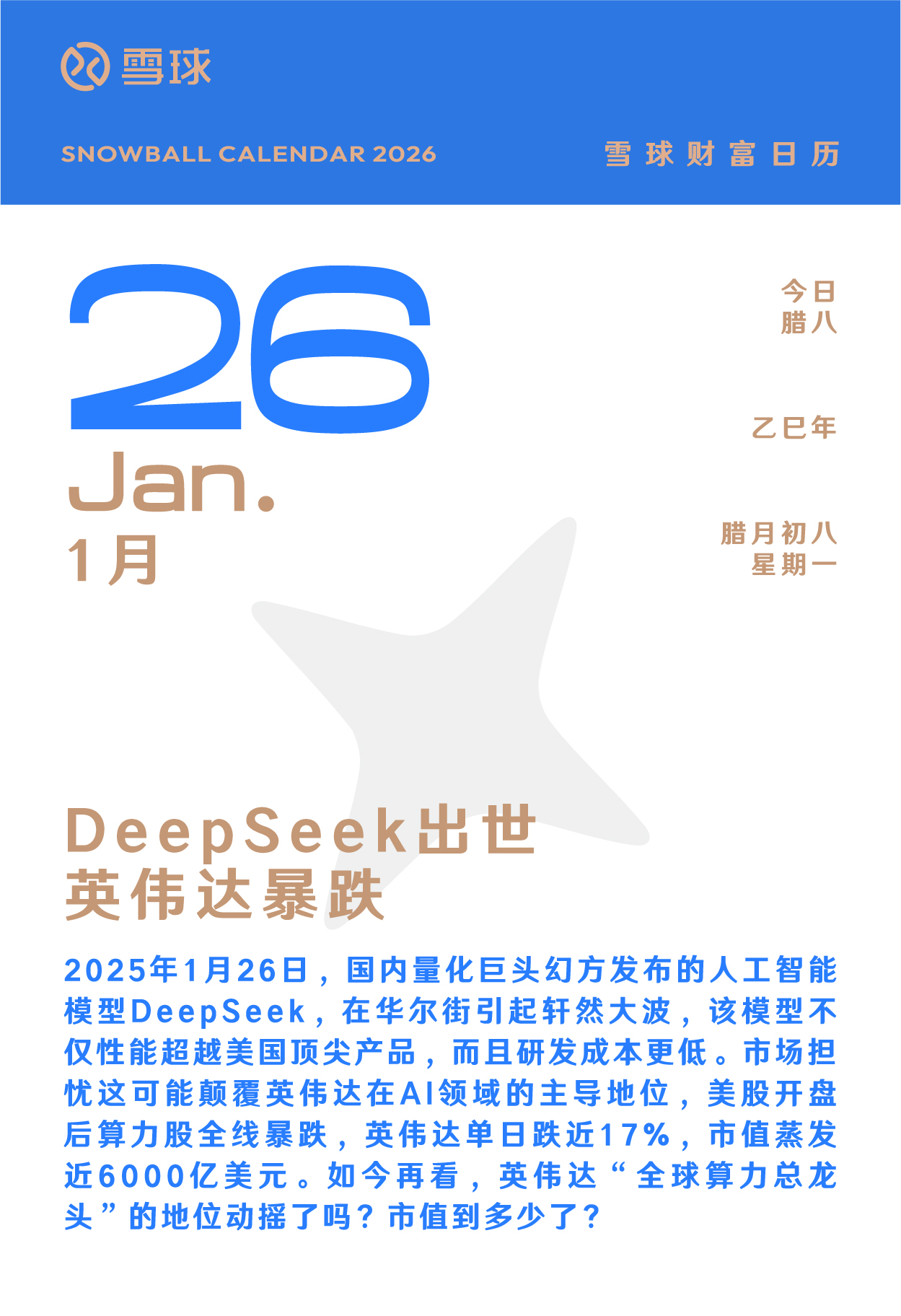 最近没事儿提前翻了翻我司出的2026雪球财富日历,突然发现,原来DeepSeek开始爆火,已经一周年了。