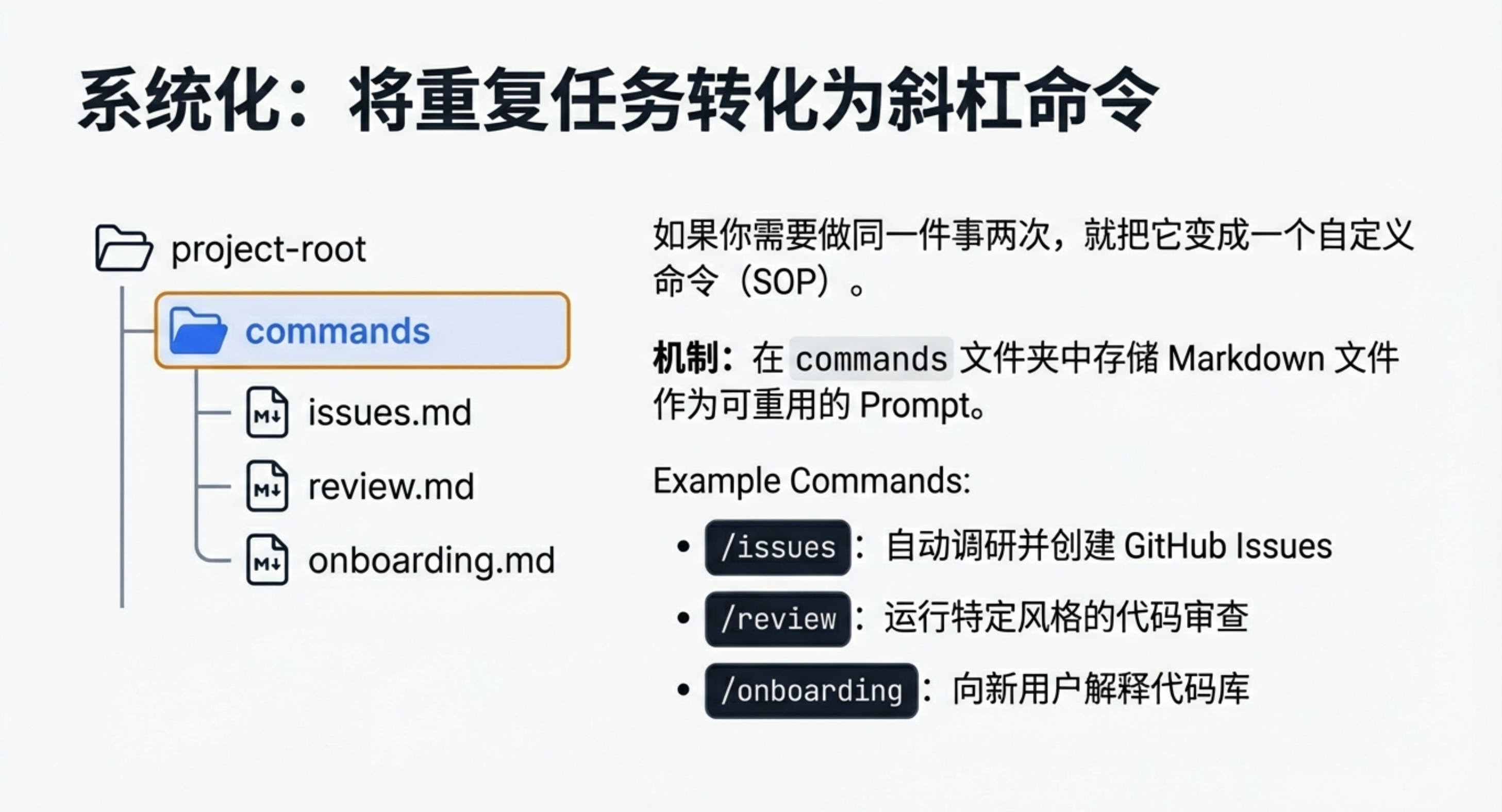 - 自定义斜杠命令:将你常用的调研或处理流程(如分析代码库问题)编写成如“