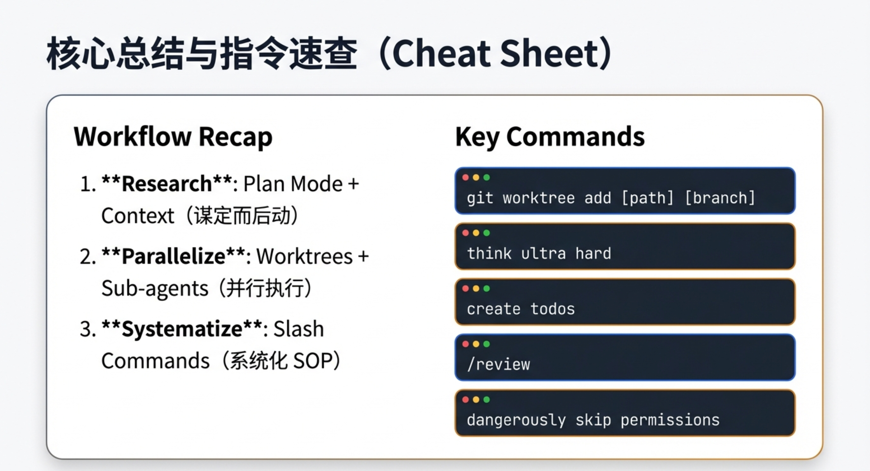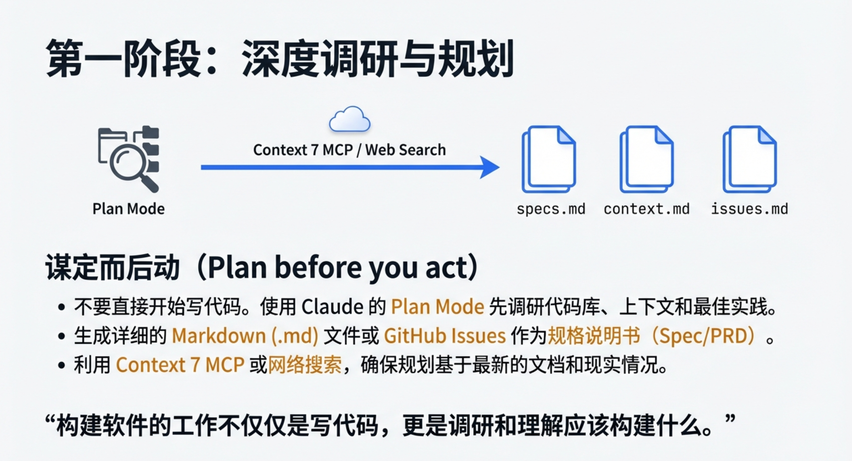 - 调研先行:在写第一行代码前,强制使用 Claude Code 的“计划模式”进行深度思考与架构设计,这能事半功倍。