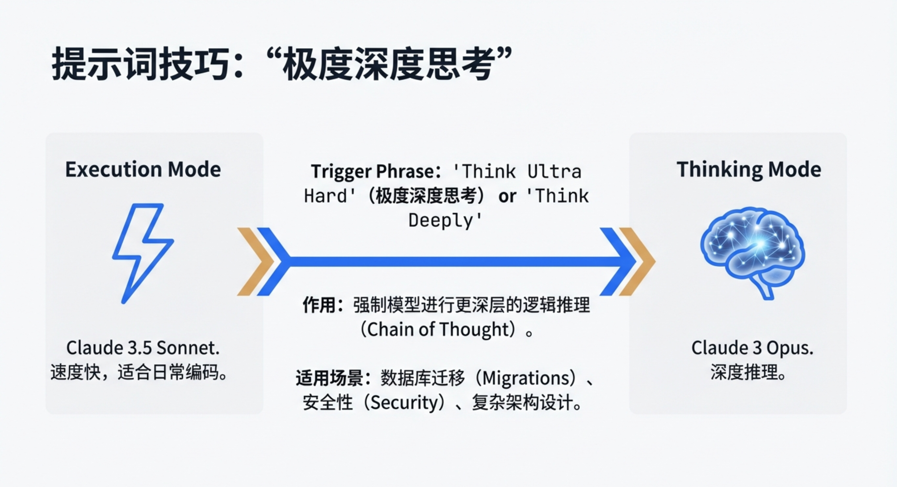 触发词:使用如“think ultra hard”(超深度思考)或“to-dos”(生成任务列表)等特定短语,精准引导 AI 的思维模式。