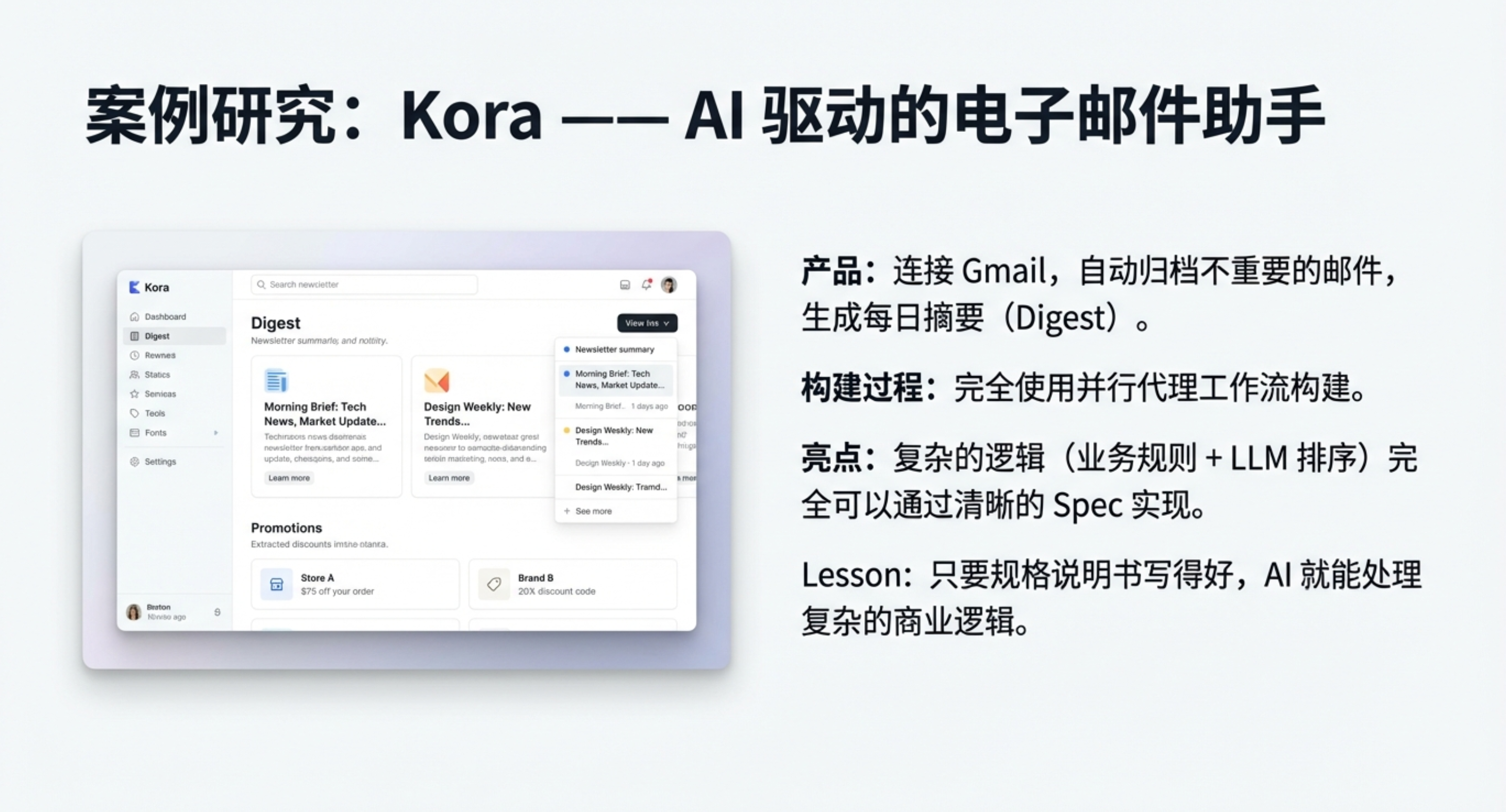 - 案例:Kora 邮件助手:Klaassen 构建的 Kora,是一个通过多模型工作流自动分类、摘要和优先处理邮件的AI助手,其核心逻辑就是让智能体接管繁琐流程,使用户获得冷静与高效。