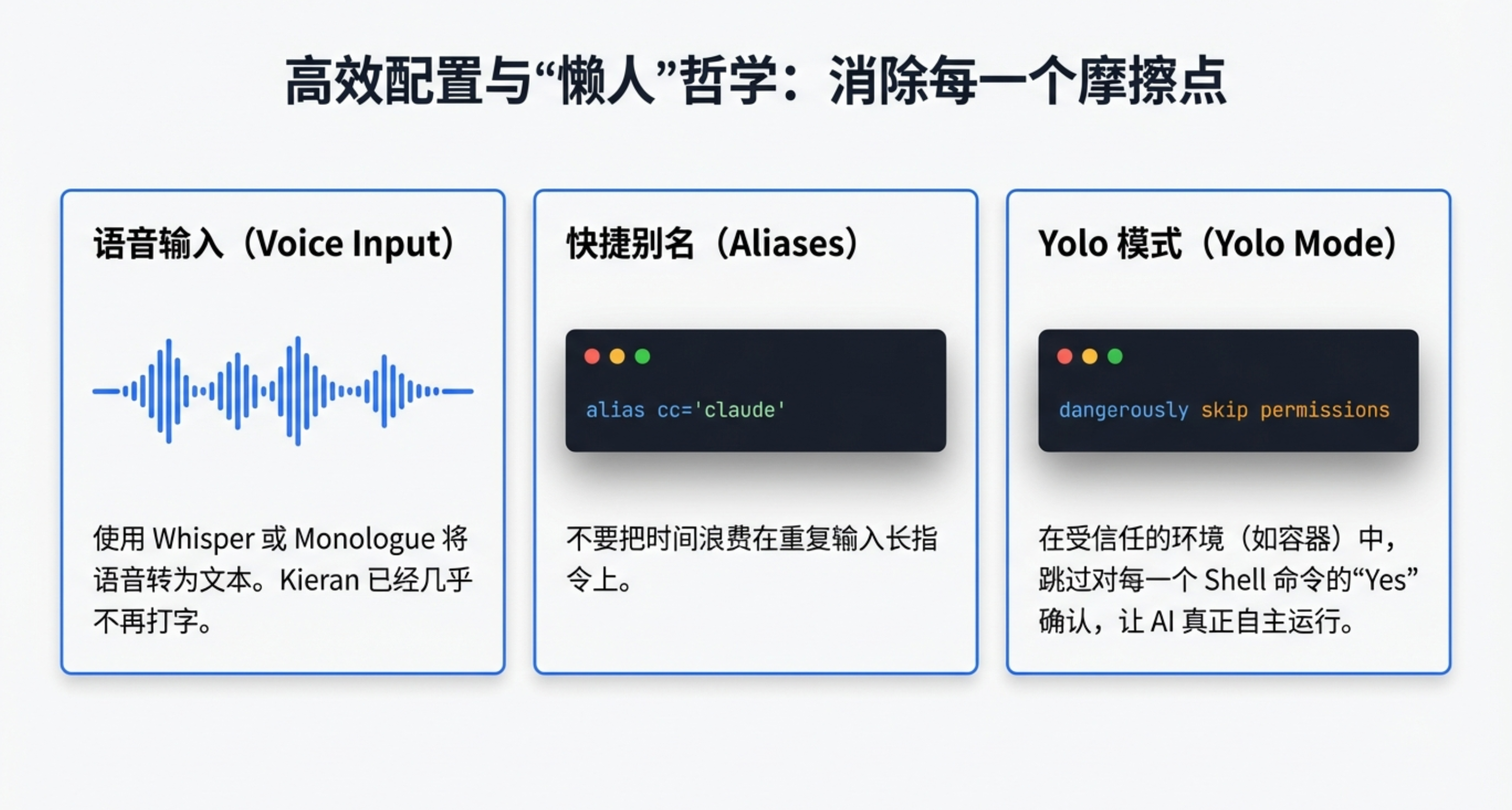 降低摩擦:整合语音转文字工具(如 Monologue)、设置命令别名,最大化减少手动输入,让你专注于战略指令。