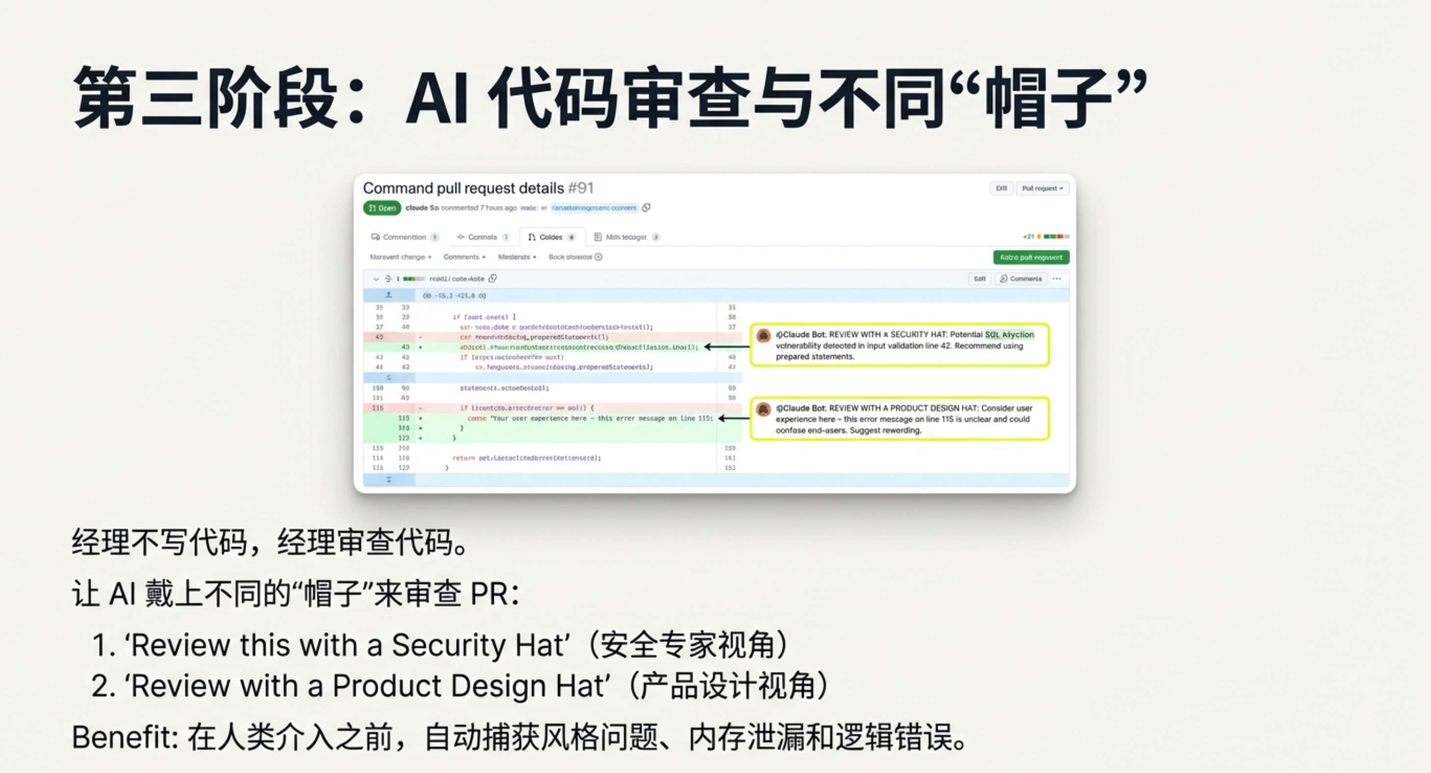/issues”这样的自定义命令,一键执行复杂操作。 - “AI 评审 AI”机制:在代码审查时,可以指派 AI 扮演安全研究员、产品经理、资深工程师等不同角色,从多维度发现那些静态检查工具无法捕捉的逻辑漏洞或“品味”问题。