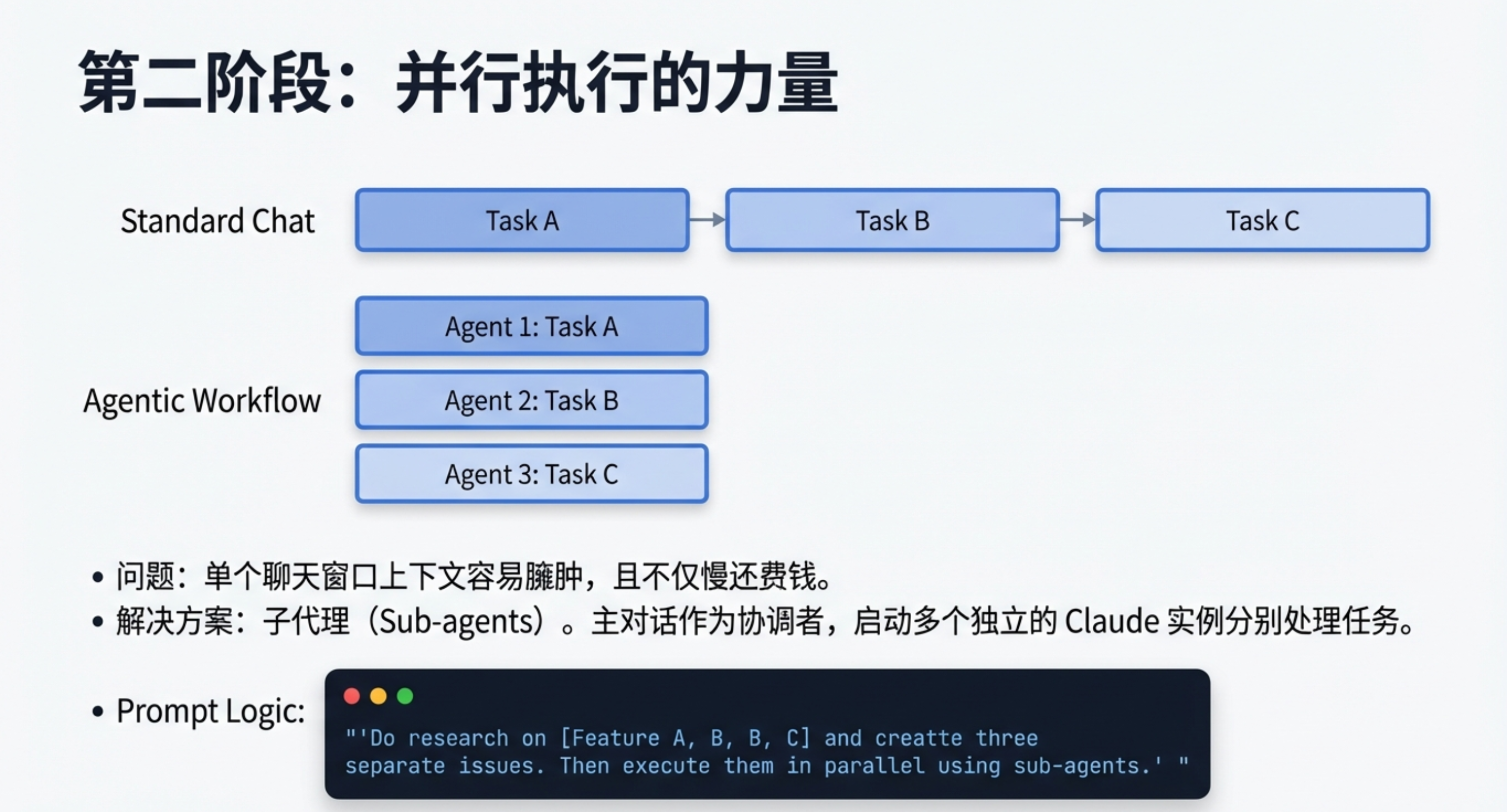 子智能体:在主对话中创建多个专注于特定任务(如调研、写 API、写UI)的子智能体,并行工作以节省时间与 Token。
