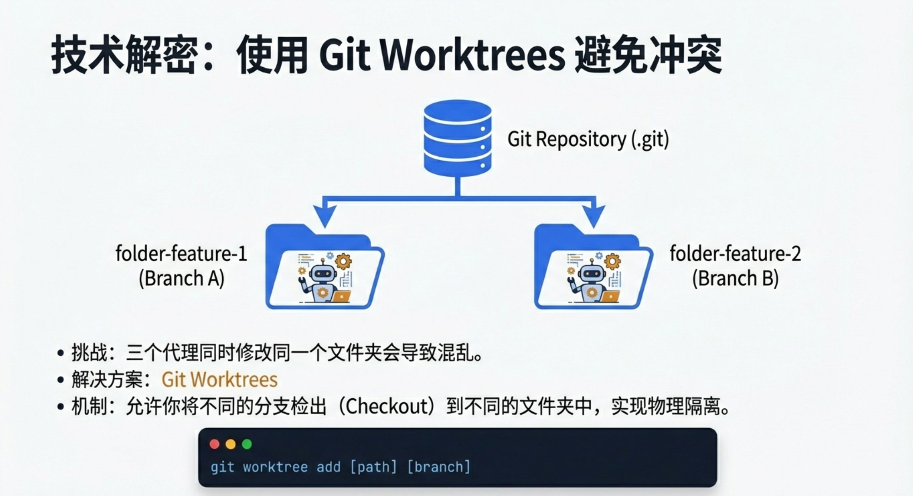 Git工作树:在本地使用 Git 工作树,为不同的智能体任务创建独立的分支和文件夹,彻底避免多个 AI 修改同一文件造成的冲突。 - 优化你的“管理语言”: