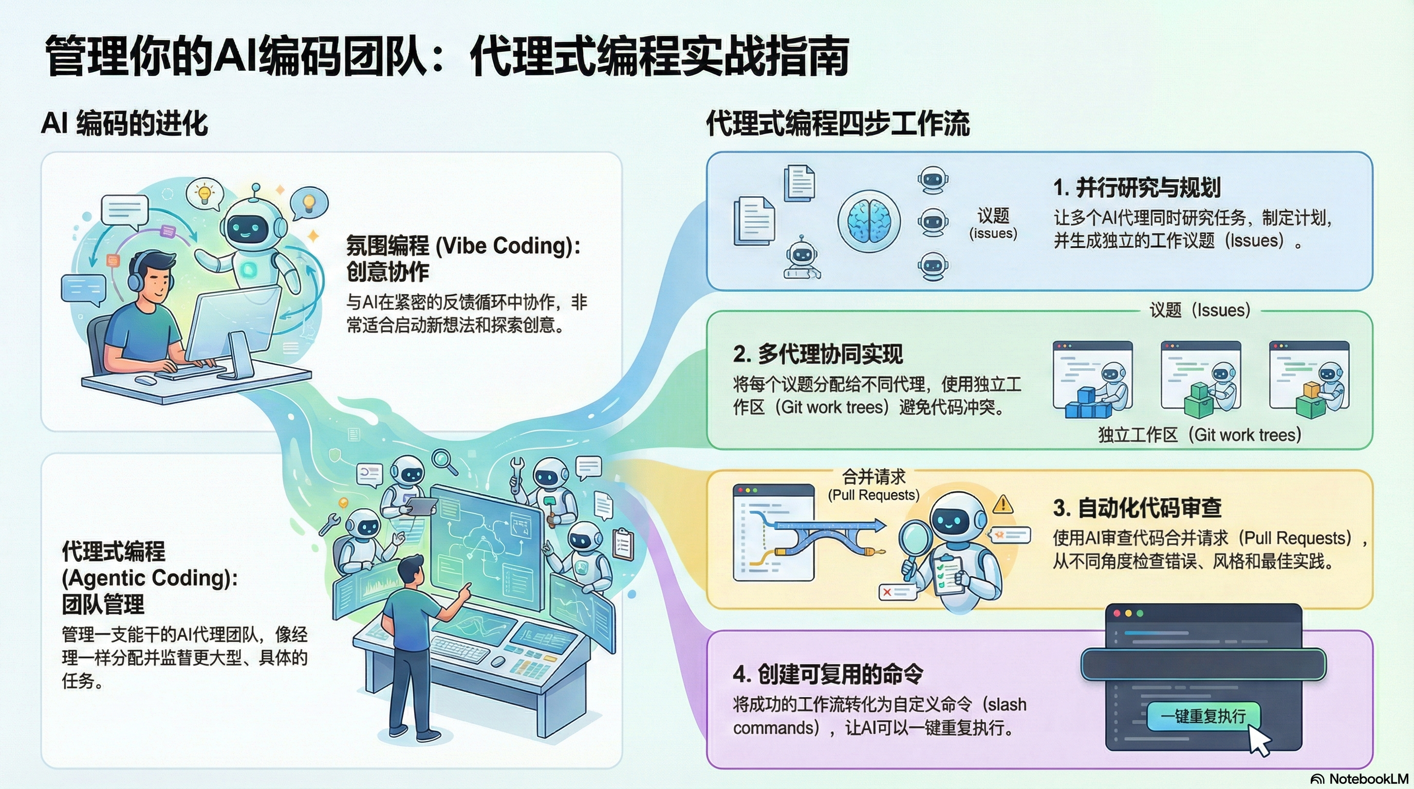 - AI 成为“团队”:你将任务分配给多个具备不同职能的AI智能体,让它们独立研究、设计和实现,你则在更高的层面(如审查拉取请求)进行验收和整合。