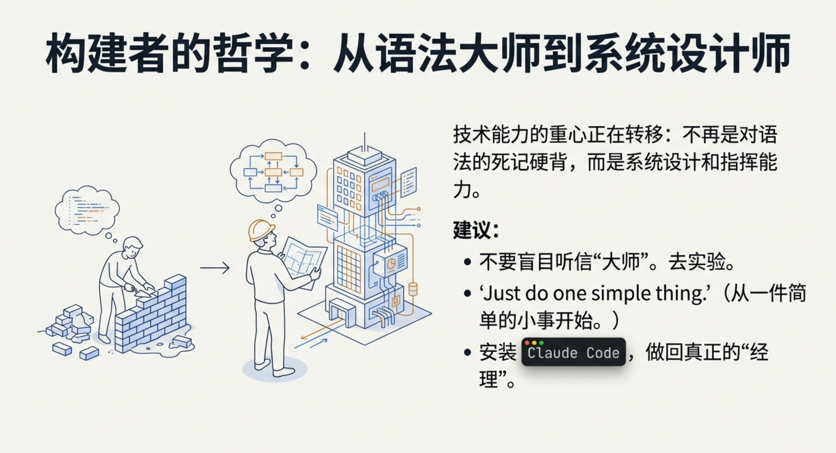 - 开发者成为“经理”:你的角色从一线“码农”转变为提供清晰规范(Spec)和宏观任务的项目经理。