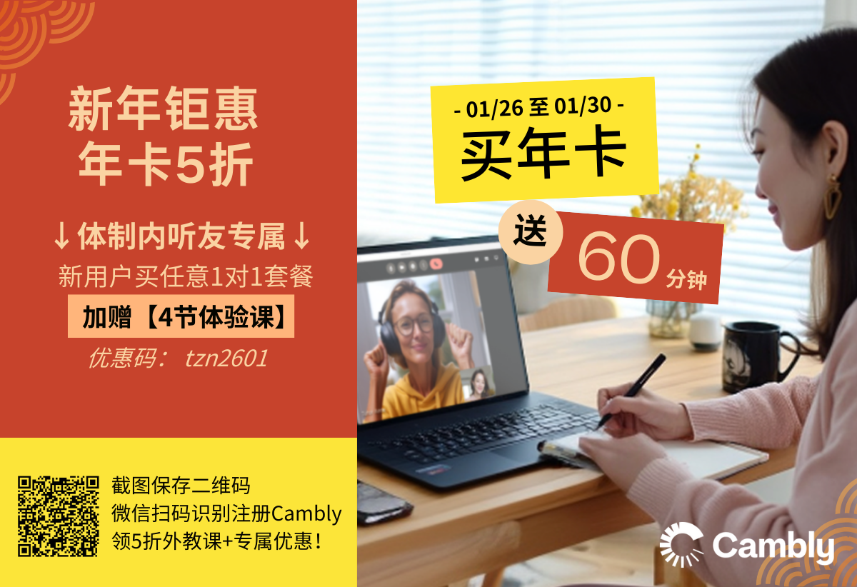 获取方式:长按保存下图至微信扫码进入活动页,或者下载Cambly APP输入优惠码【TZN2601】,即可获取优惠哦~