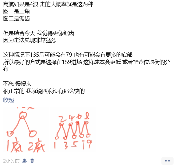 ①文字:“商航如果是4浪,走的大概率就是这两种: 图一是三角 图二是锯齿 但是结合今天,我觉得更像锯齿,因为走法兑现非常猛烈 这种情况下135后可能会有79,也有可能会有更多的底部。 所以最好的方式是选择在159进场,这样成本会更低,或者把仓位均衡的分布 不急,慢慢来 很正常的,我就说四浪没有那么快的”