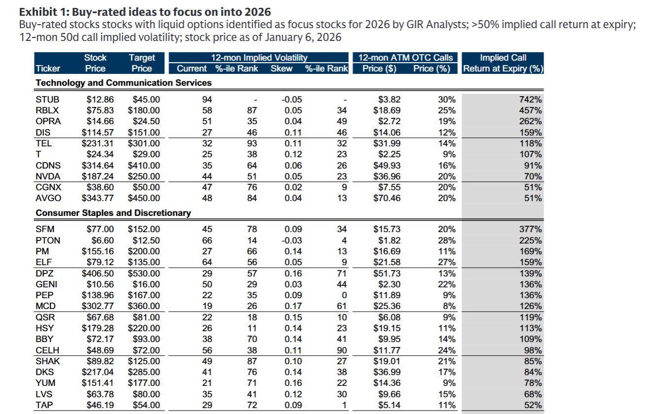 - Exhibit 1(研报第2页):《2026年重点买入评级标的》,汇总了56只个股的当前股价、目标价、12个月隐含波动率及看涨期权回报率。数据显示,科技股整体回报率居前,STUB从12.86美元目标价冲至45美元,回报率达7倍以上,而NVDA、AVGO等龙头也有50%-70%的潜在空间,直观呈现各行业标的的收益潜力。