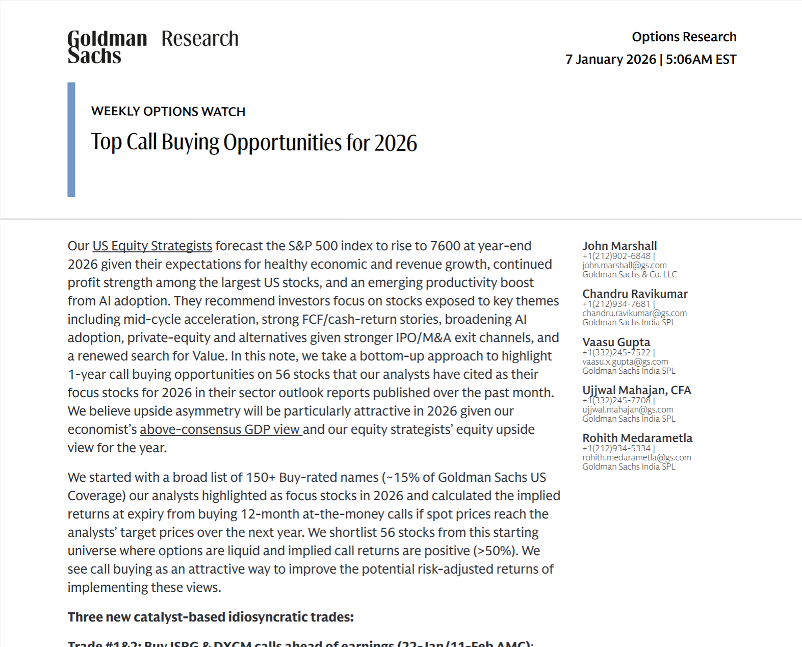 高盛研究部2026年1月7日发布的《Top Call Buying Opportunities for 2026》明确指出,伴随经济健康增长、AI生产力释放及龙头企业盈利走强,标普500指数年末有望触及7600点,56只具备高流动性和高潜在回报的个股,其一年期看涨合约将成为核心关注标的。