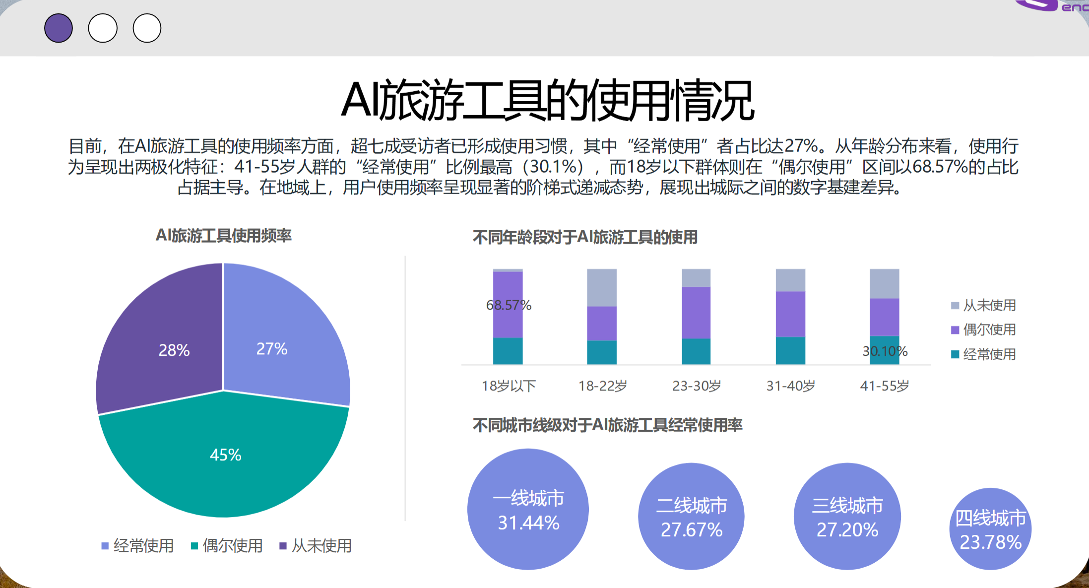 研报PART02的“AI旅游工具使用频率及年龄分布”图表,暴露了一个有趣的趋势:超七成受访者已形成AI旅游工具使用习惯,其中27%“经常使用”。年龄分布呈现两极化:41-55岁人群“经常使用”比例最高,达30.1%,而18岁以下群体68.57%选择“偶尔使用”;地域上,一线城市经常使用率31.44%,四线城市23.78%,阶梯式差异凸显数字基建的影响。